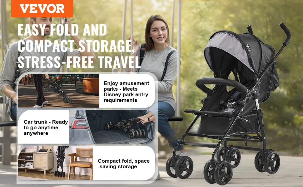 Ten przenośny wózek ma składaną konstrukcję, jest kompaktowy po złożeniu, spełnia wymogi dostępu do parków Disneya i z łatwością mieści się w bagażniku samochodu. Jest również łatwy do przechowywania w domu.