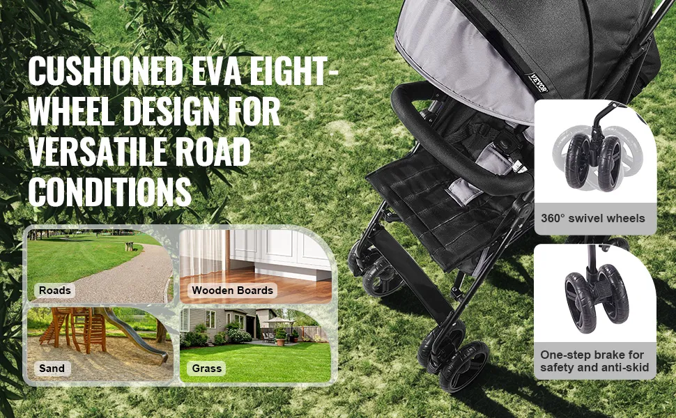 Wysoka nośność: Ten wózek, dzięki solidnej ramie ze stali węglowej, wytrzymuje obciążenie do 15 kg, dzięki czemu jest odpowiedni dla dzieci w wieku od 6 miesięcy do 3 lat. Wyposażony jest w osiem wysokoelastycznych opon EVA z wbudowaną amortyzacją, które radzą sobie z wyboistymi drogami i zapewniają komfortową jazdę.