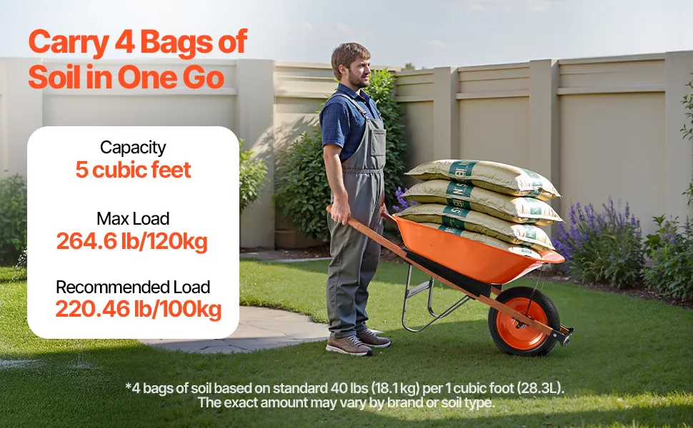 Duża pojemność wanny: Nasza wywrotka ogrodowa posiada przestronną wannę o pojemności 5 stóp sześciennych i ładowności 120 kg (265 funtów). Szeroka powierzchnia równomiernie rozprowadza nacisk, dzięki czemu idealnie nadaje się do bezproblemowego transportu ciężkich przedmiotów, takich jak żwir, ziemia, nawóz i narzędzia.