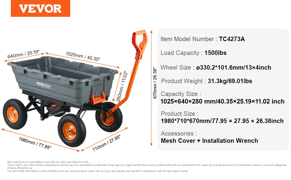 Wózek wywrotki VEVOR jest łatwy w montażu. Posiada solidną stalową ramę. Dzięki temu jest niezawodny w różnych zadaniach. Można go szybko złożyć i zacząć używać. Solidna rama zapewnia trwałość. Jest zaprojektowany tak, aby poradzić sobie z dużymi ładunkami bez pękania, co czyni to narzędzie niezwykle cennym do użytku domowego i komercyjnego. Proces montażu jest prosty. Dzięki temu oszczędzasz czas i wysiłek. Stalowa rama zwiększa jego trwałość. Możesz zaufać mu w przypadku długotrwałego użytkowania, ponieważ jest idealny dla tych, którzy potrzebują niezawodnego wózka, który jest gotowy do drogi.
