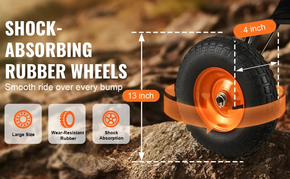 Wózek jest wyposażony w 13-calowe opony. Opony te zapewniają płynny ruch na różnych nawierzchniach. Możesz łatwo poruszać się po nierównym terenie. Duże opony zapewniają stabilność i ułatwiają przesuwanie wózka. Jest to szczególnie przydatne podczas przewożenia ciężkich ładunków. Są zaprojektowane do radzenia sobie z różnymi nawierzchniami. Nie ma znaczenia, czy jest to trawa, żwir czy beton. Duże opony pomagają również w ogólnej wytrzymałości wózka. To praktyczna funkcja, która pomaga poprawić wydajność wózka.