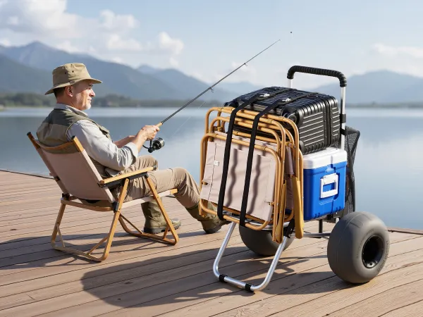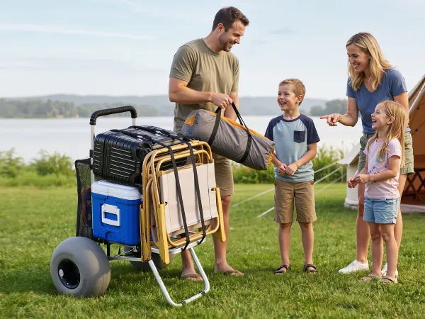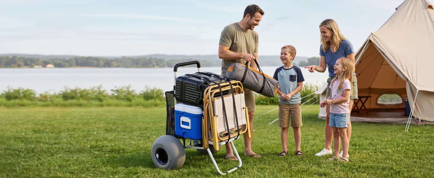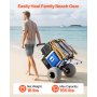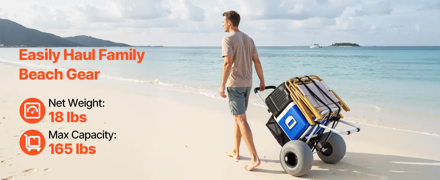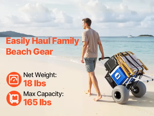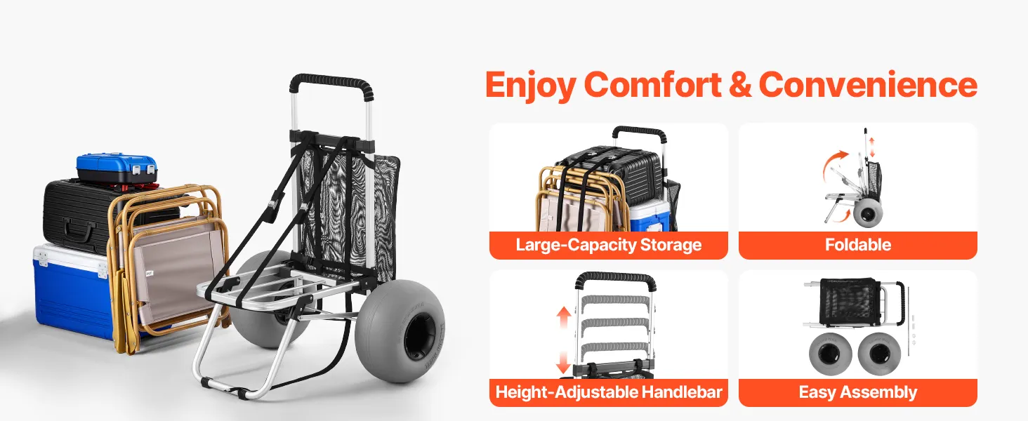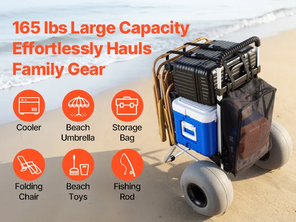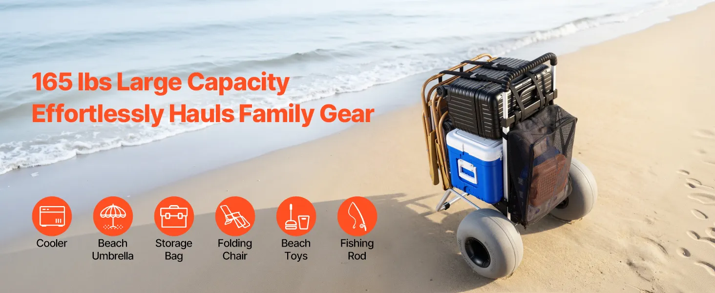 • Dużo miejsca do przechowywania: Wózek może udźwignąć do 75 kg (165 funtów), dzięki czemu idealnie nadaje się do transportu ciężkiego sprzętu outdoorowego. Oferuje mnóstwo miejsca na chłodziarki, torby do przechowywania, składane krzesła, parasole i inne akcesoria.