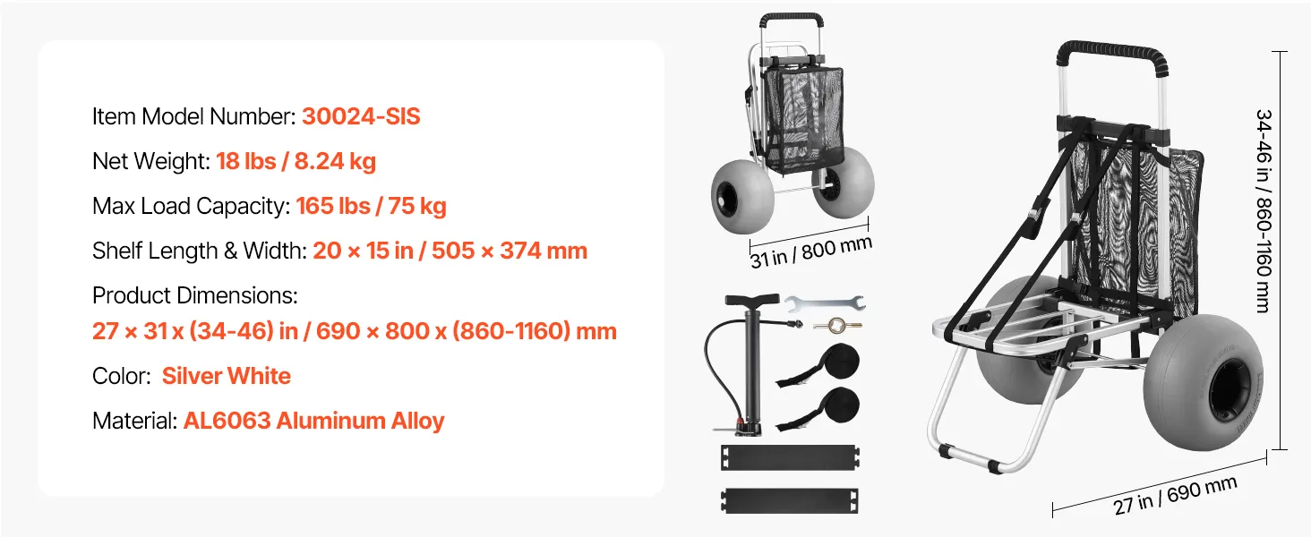 Wózek plażowy VEVOR z oponami balonowymi (12 cali), składany wózek plażowy (aluminiowa rama) z 4-stopniowo regulowanym uchwytem piankowym, wózek ręczny (nośność 75 kg), wózek plażowy na kemping i wędkowanie