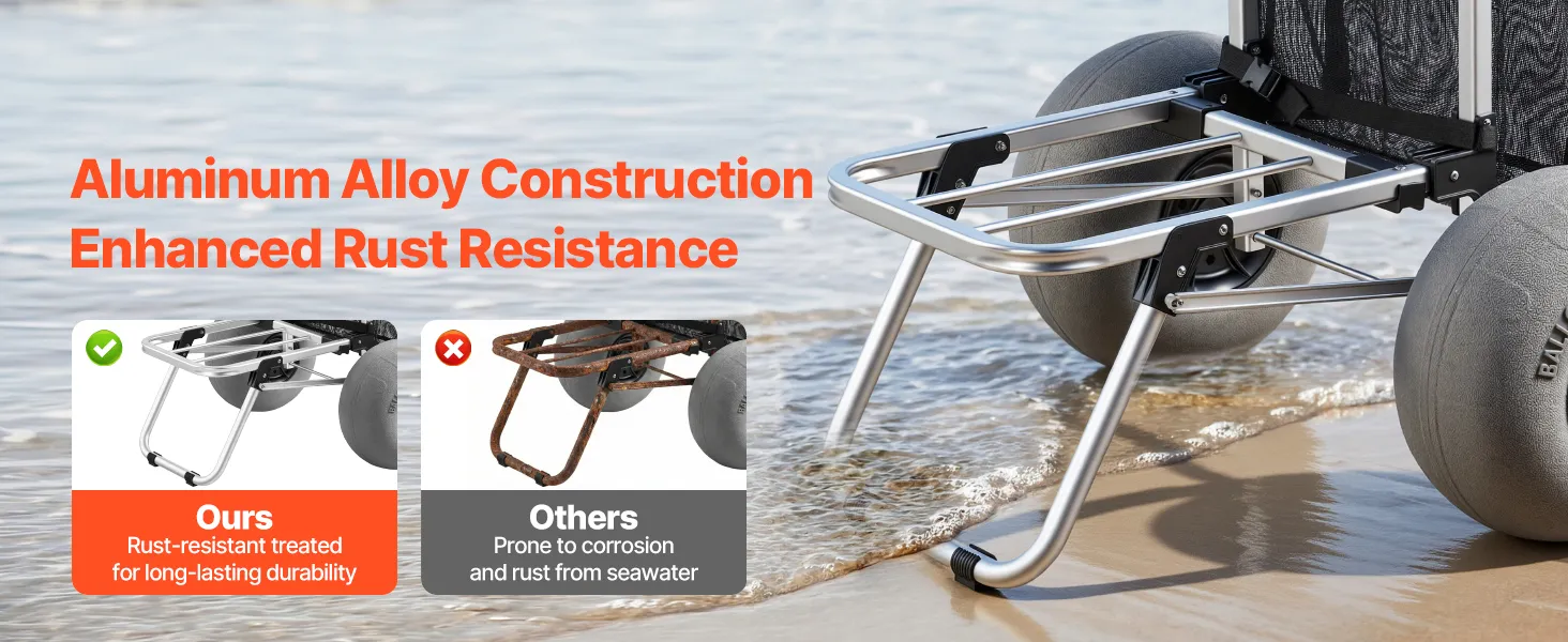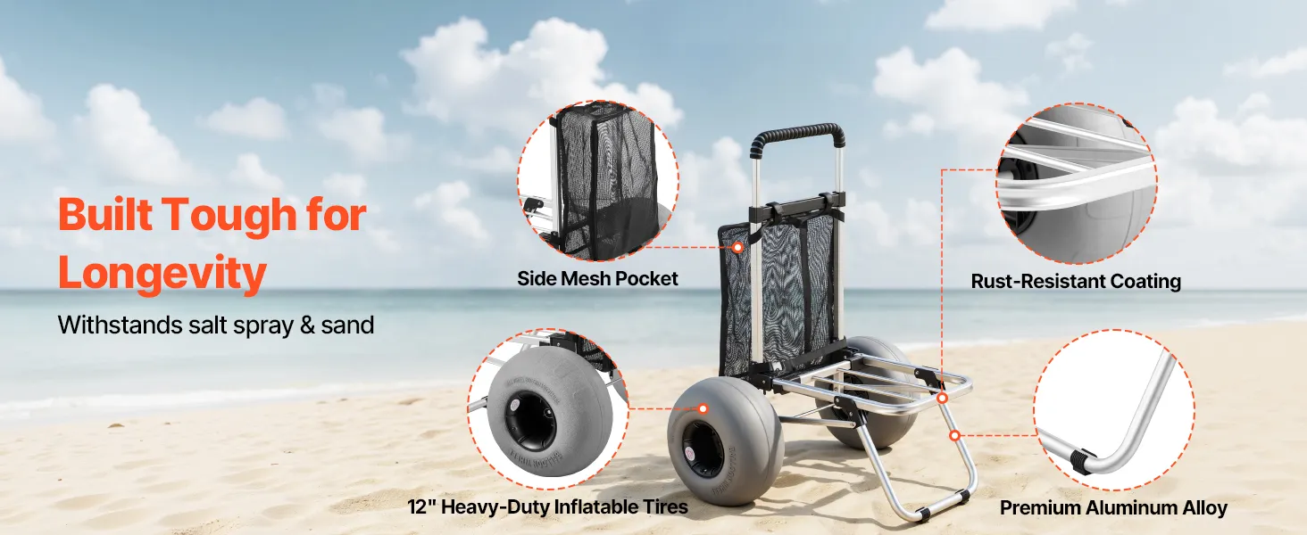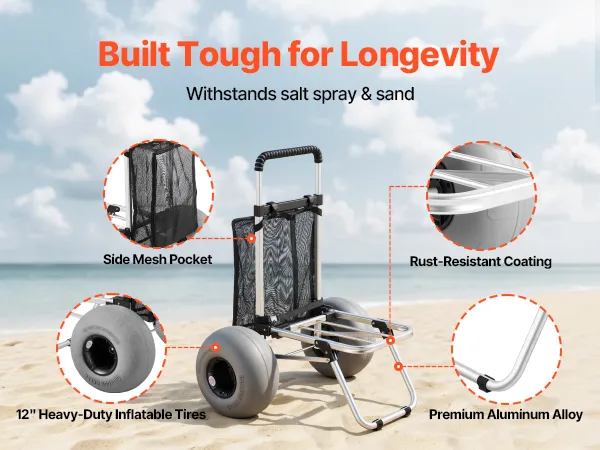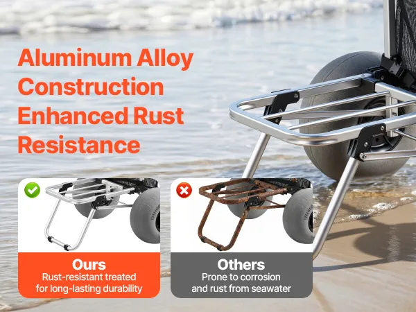 • Wytrzymały i trwały: Nasz wózek plażowy posiada solidną ramę ze stopu aluminium z powłoką odporną na rdzę. Jest odporny na słoną wodę i piasek o właściwościach ściernych. Dzięki solidnej konstrukcji zachowuje swoją wytrzymałość strukturalną nawet po długim użytkowaniu.