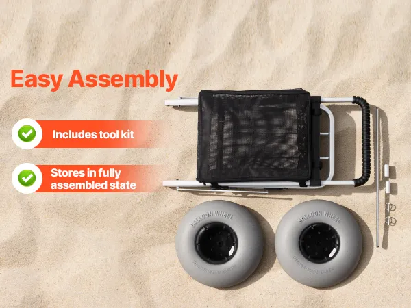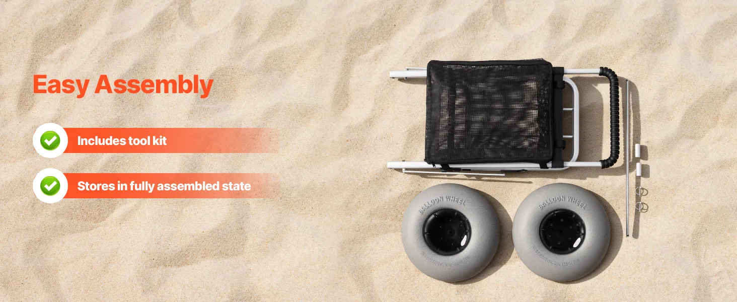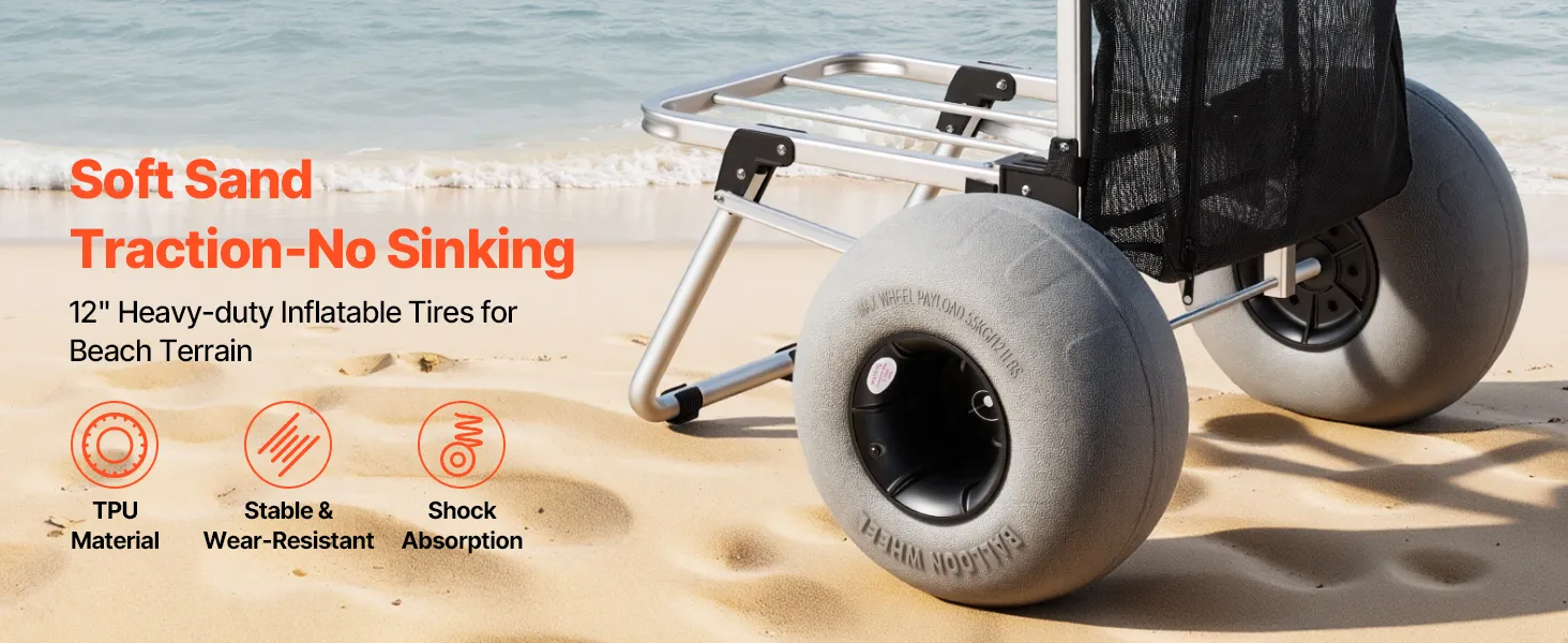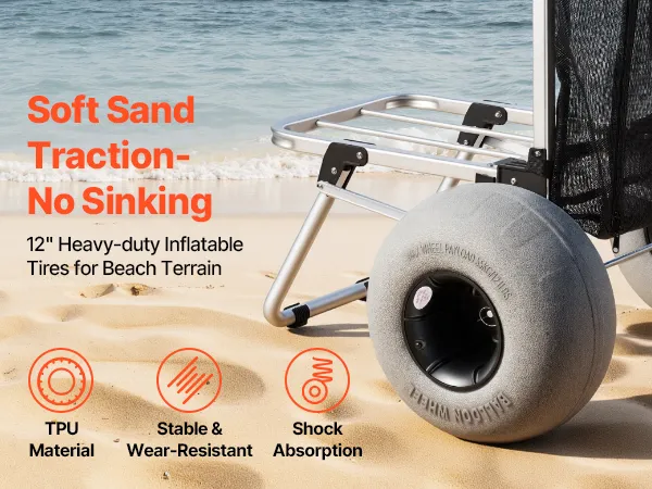 • Bezproblemowe podróżowanie po plaży: Ten wózek plażowy jest wyposażony w wyjątkowo duże, szerokie koła zaprojektowane specjalnie do piaszczystych powierzchni. Płynnie toczy się po miękkim piasku, zmniejszając ryzyko zatonięcia lub utknięcia. Dla łatwiejszego transportu i bardziej relaksującego wypoczynku na plaży.