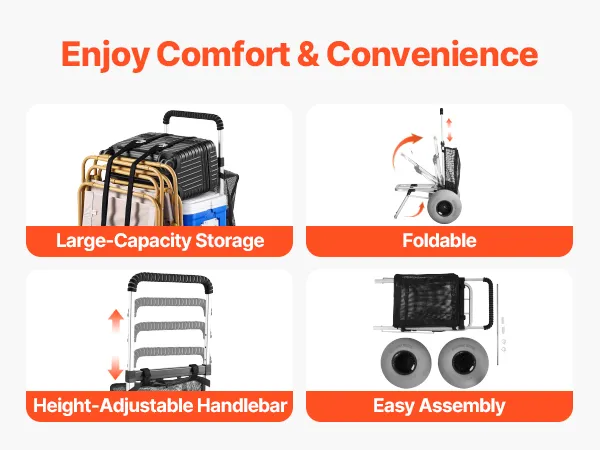 • Kompaktowy i przenośny: Ten wózek ręczny posiada 4-stopniową regulację uchwytu, umożliwiającą regulację wysokości. Dzięki mechanizmowi szybkiego składania można go przechowywać w sposób oszczędzający miejsce. Zmieści się w bagażniku samochodu lub w kącie domu.