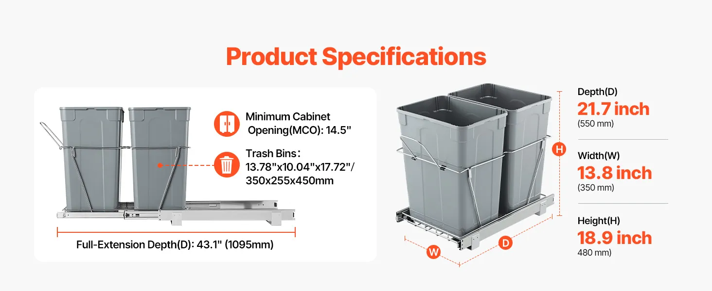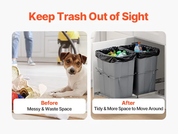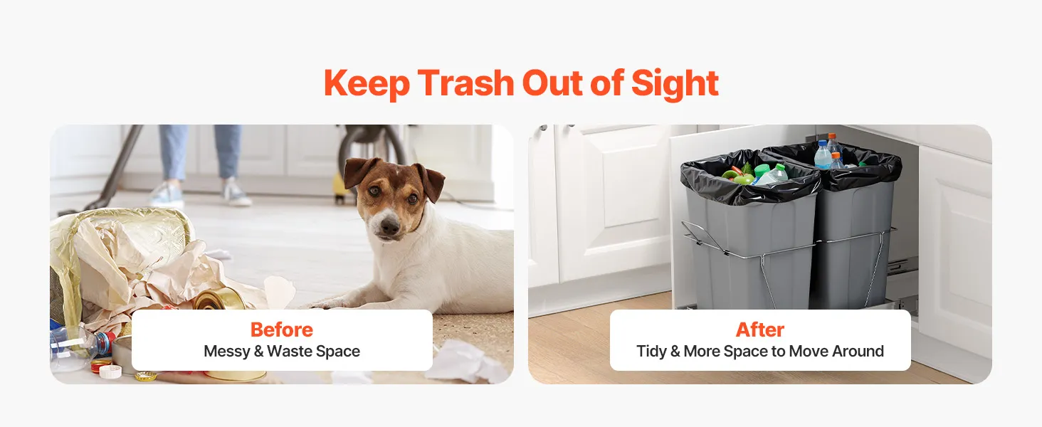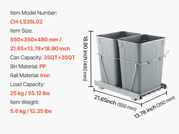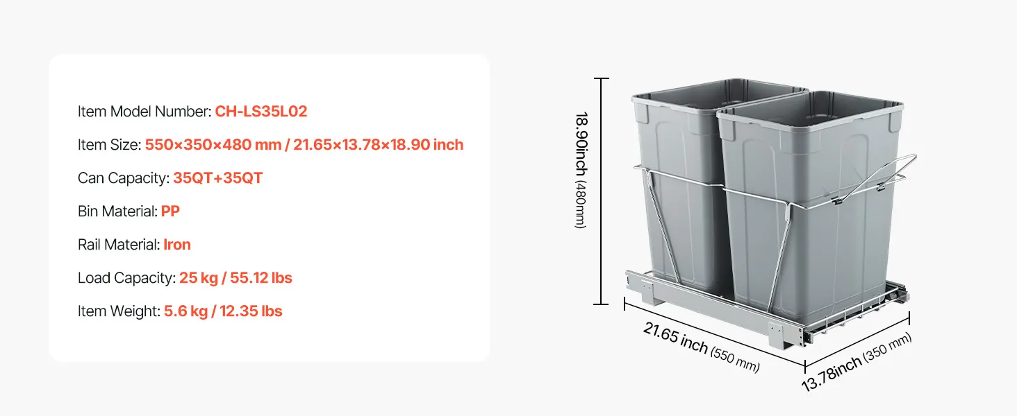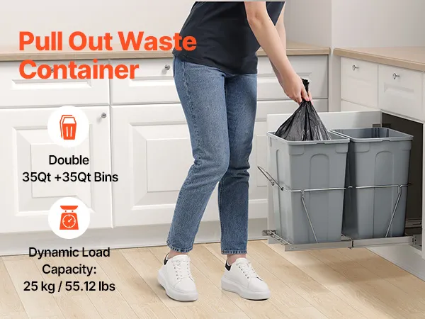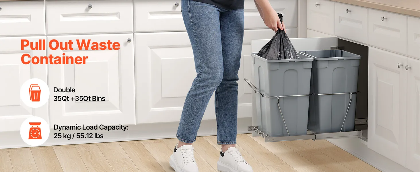 Duża pojemność 35QT+35QT, aby zmaksymalizować przestrzeń w kuchni. Kosz na śmieci podblatowy mieści do 25 kg/55,12 funtów śmieci.