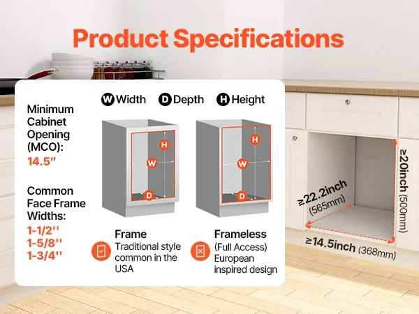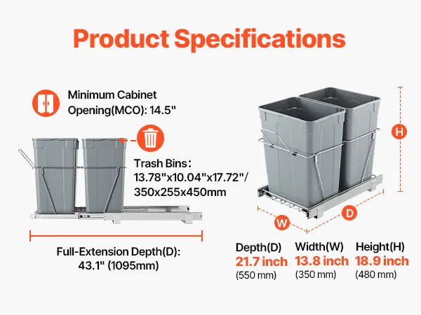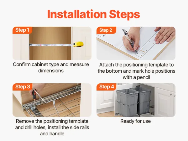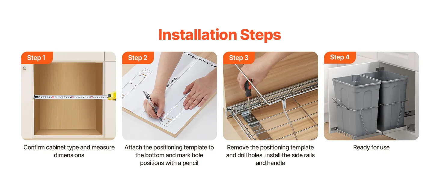 Łatwy montaż w kilka minut: Dzięki dołączonym otworom montażowym i śrubom, kosz na śmieci można szybko i łatwo zamontować w szafce. Zalecany rozmiar szafki: Głębokość (przód i tył): ≥ 565 mm (22,2 cala); Szerokość (prawa i lewa): ≥ 368 mm (14,5 cala); Wysokość (góra i dół): ≥ 500 mm (20 cali). Po zmierzeniu szafki, kosz na śmieci można zamontować w kilka minut.