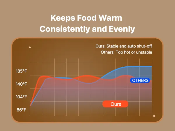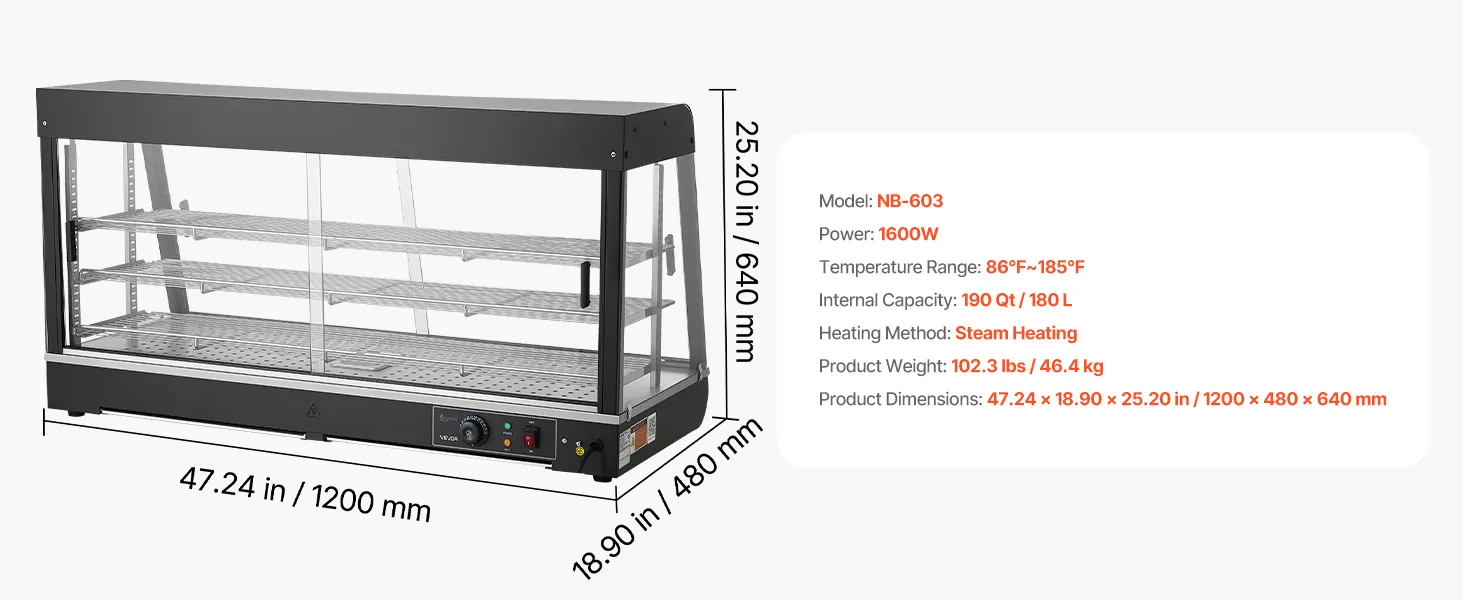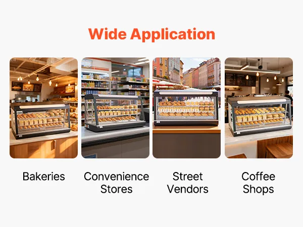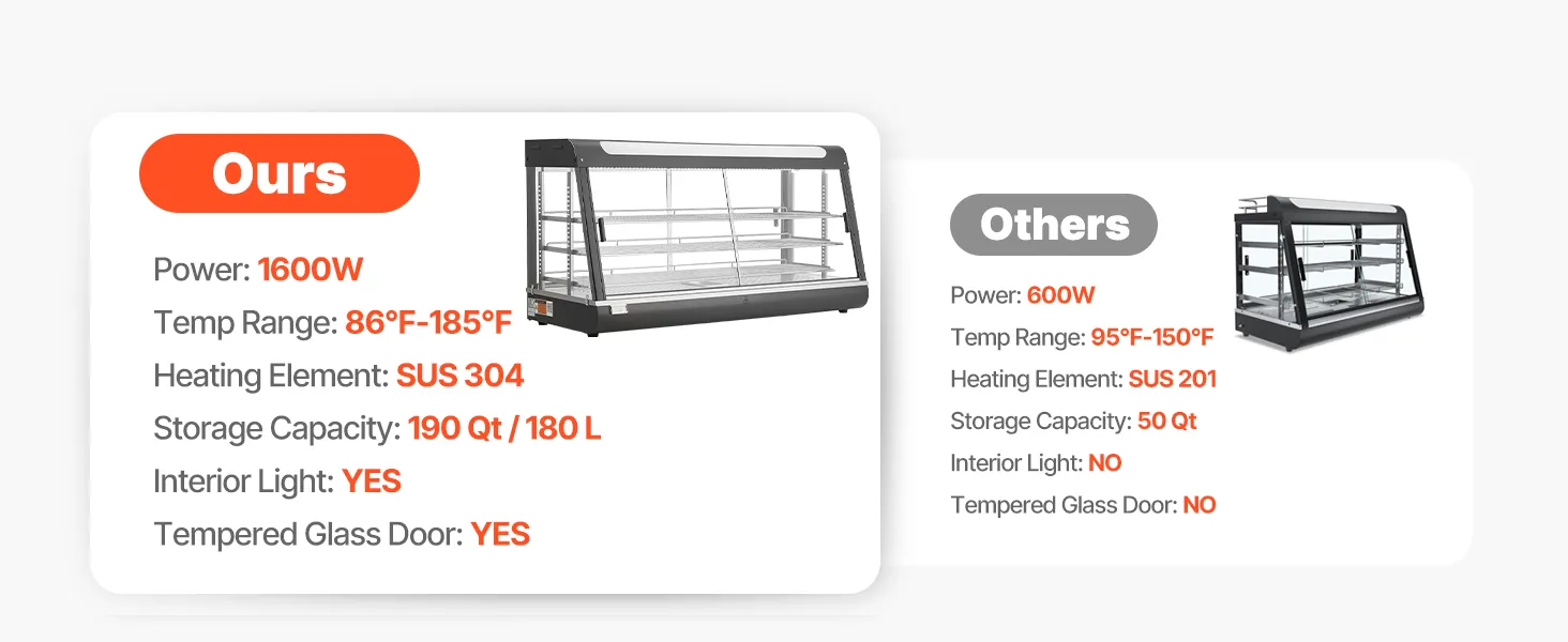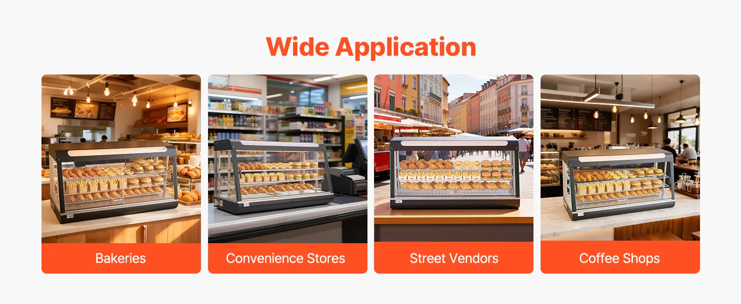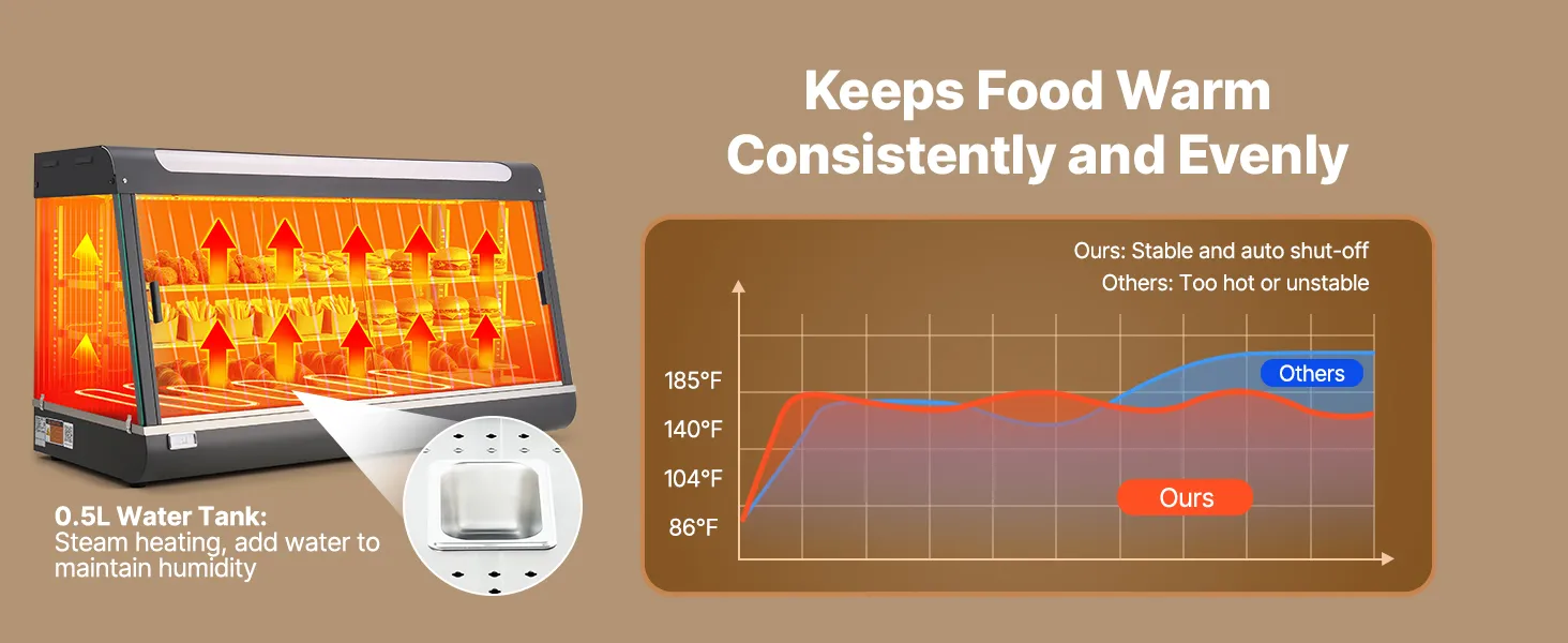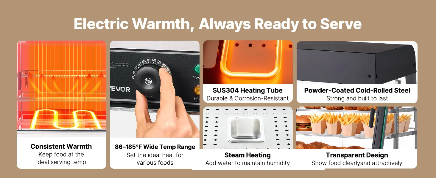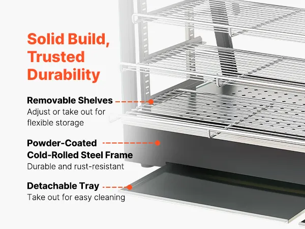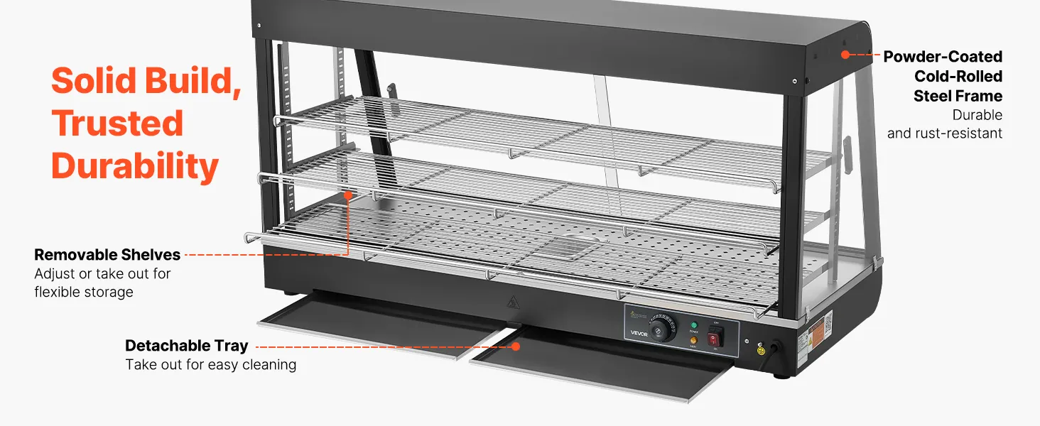 • Duża pojemność dzięki wielu poziomom: Wyposażony w 3 wyjmowane półki, ten podgrzewacz oferuje mnóstwo miejsca na naleśniki, burgery, pieczywo i wiele innych produktów. Płaska półka na górze zapewnia dodatkową przestrzeń do przechowywania napojów lub paczkowanej żywności, utrzymując porządek na blacie roboczym.