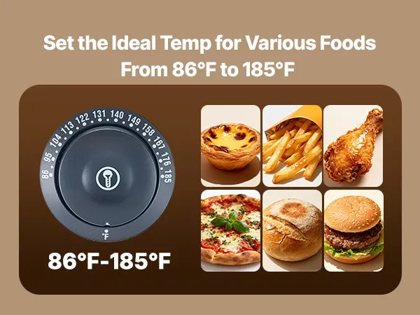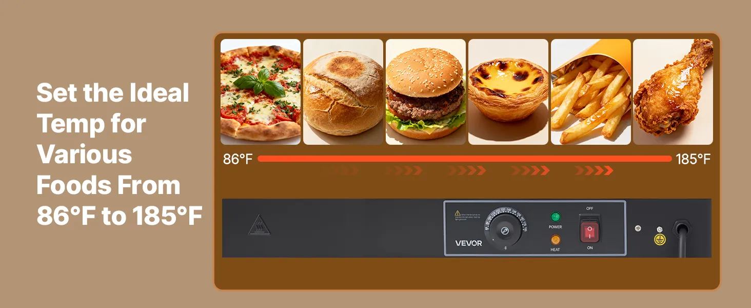 • Stała temperatura: Ta podgrzewana witryna utrzymuje żywność w stałej temperaturze, zapewniając jej gotowość do podania. Wyposażona jest w łatwe w obsłudze pokrętło z regulacją temperatury w zakresie 30–85°C (86–185°F) dla różnych produktów spożywczych.