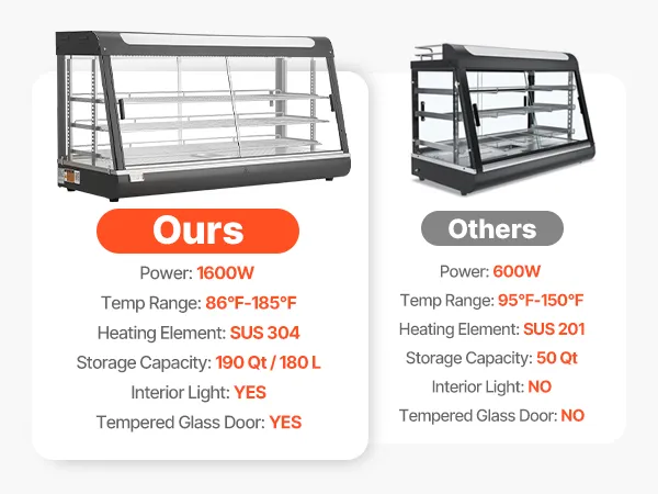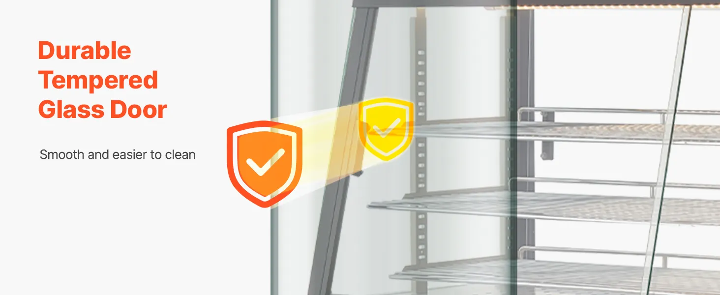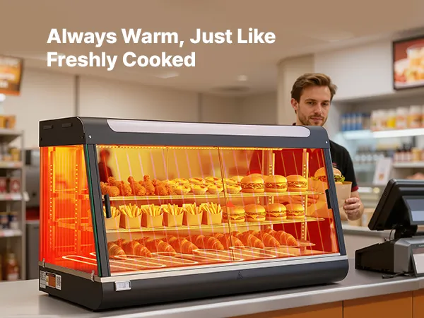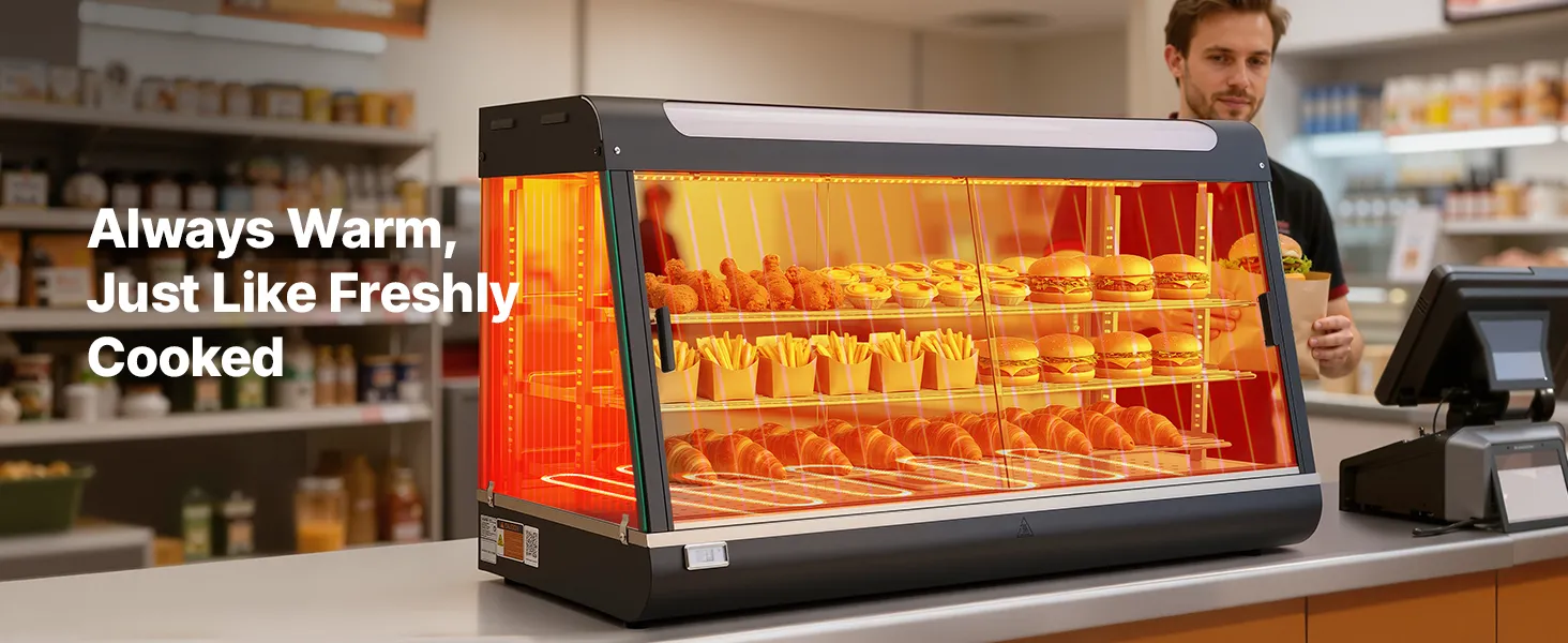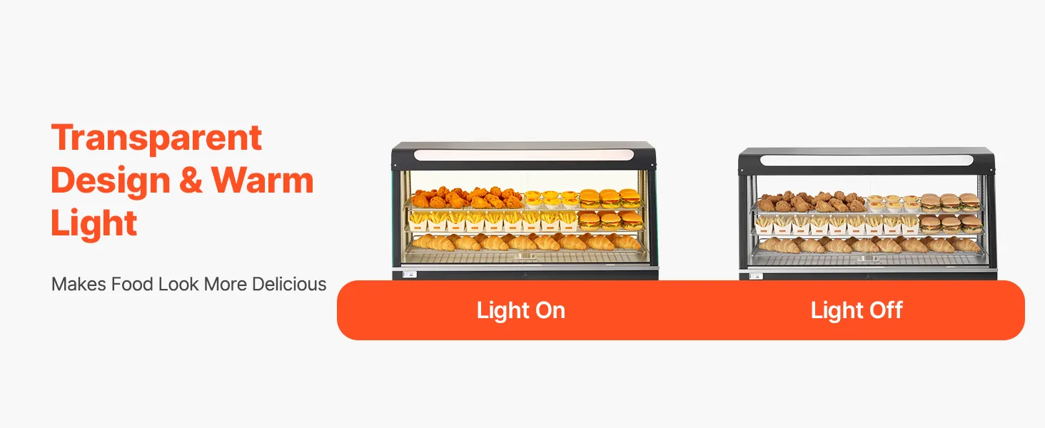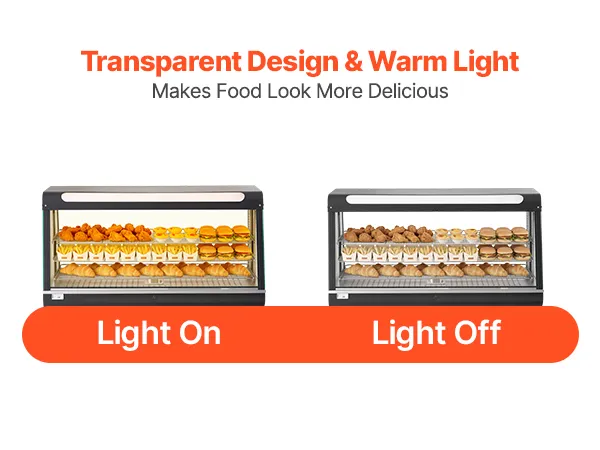 • Transparentna konstrukcja z oświetleniem LED: Ta podgrzewana witryna jest wykonana z grubego, hartowanego szkła, które zatrzymuje ciepło i doskonale eksponuje produkty. Zintegrowane, ciepłe, białe światło LED sprawia, że ​​jedzenie wygląda bardziej apetycznie i przyciąga klientów.