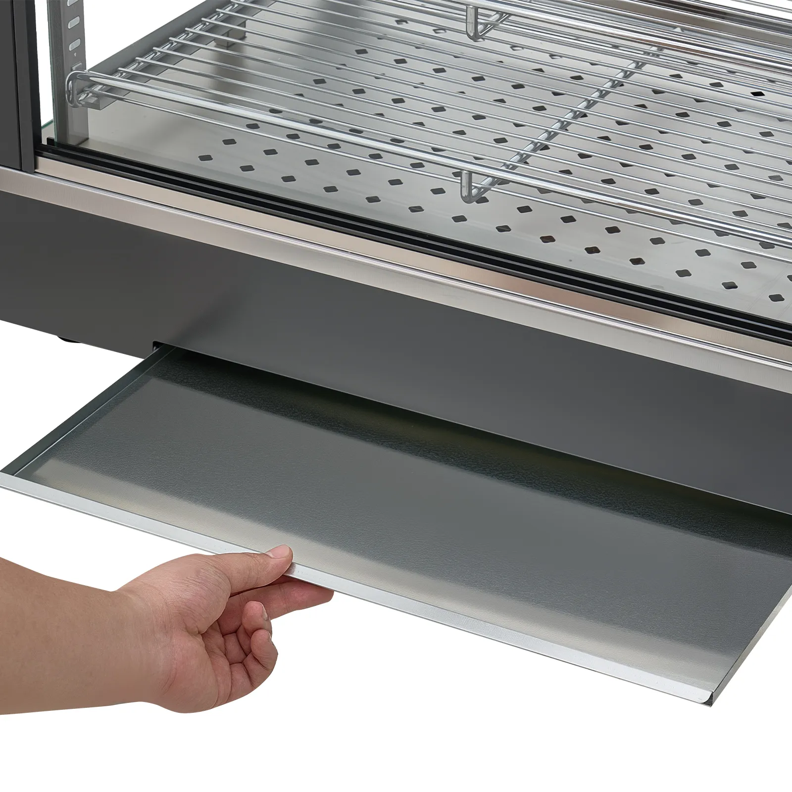• Łatwe czyszczenie i konserwacja: wyjmowane półki i tacka na okruchy na spodzie umożliwiają szybkie i łatwe czyszczenie, dzięki czemu podgrzewacz do żywności jest zawsze czysty i gotowy do użycia na blacie roboczym.
