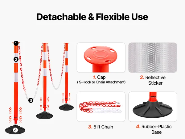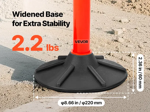 Elastyczne i przenośne: Nasze słupki posiadają końcówkę w kształcie strzały i przenośną podstawę, co ułatwia ich transport i rozstawianie. Ośmiokątna gumowa podstawa jest wystarczająco ciężka, aby zachować stabilność nawet w przypadku przypadkowego przewrócenia, gwarantując niezawodne działanie.