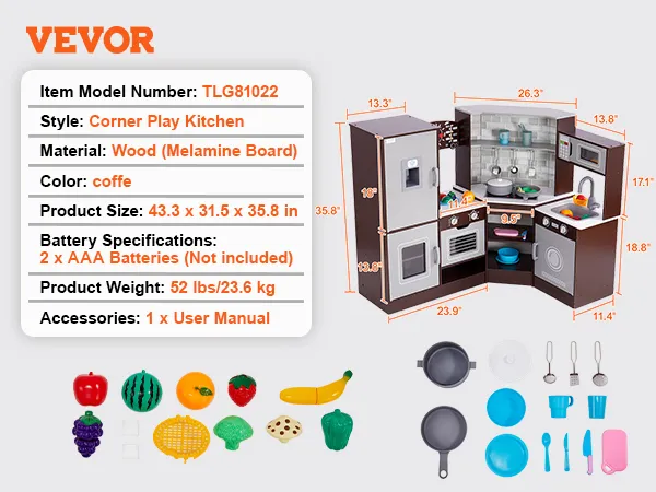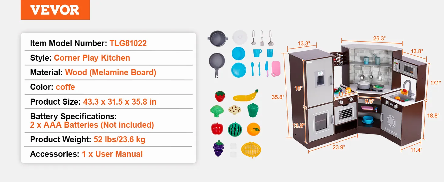 Zestaw kuchenny VEVOR z drewnianym narożnikiem i światłami, kuchnia dla maluchów z maszynką do lodów, piekarnikiem, zlewem, zegarem, kuchenką mikrofalową, lodówką i akcesoriami, dla maluchów i przedszkolaków, brązowy