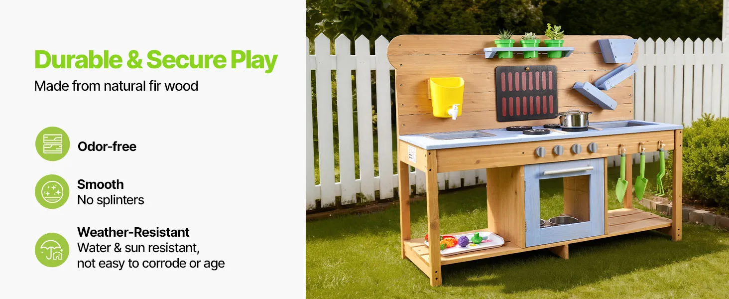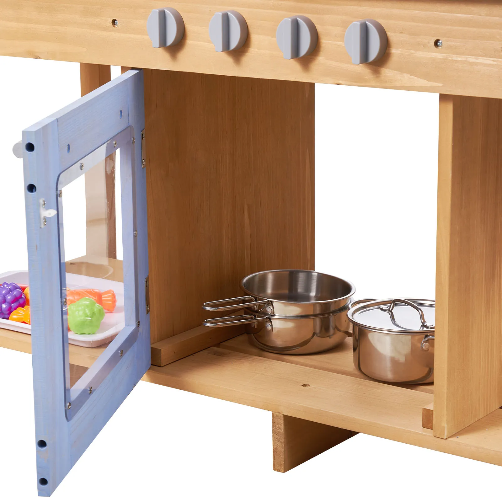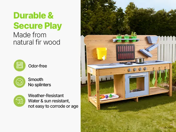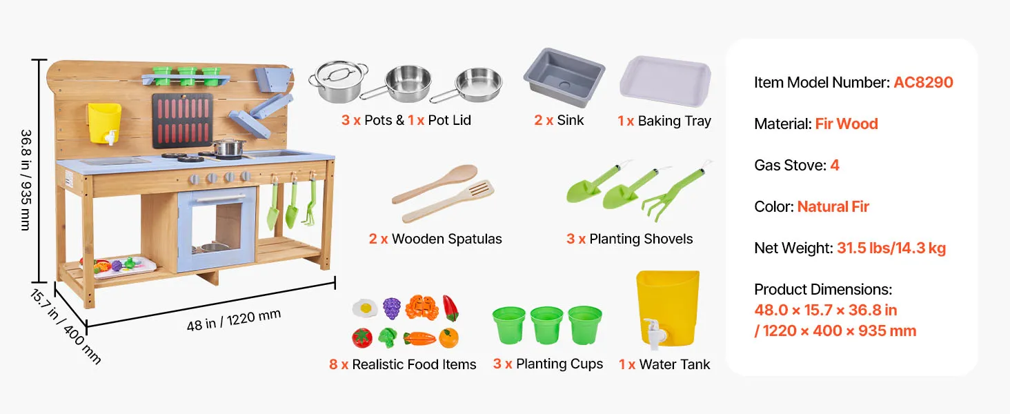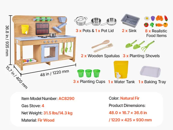 Kuchnia zabawkowa VEVOR, kuchnia dla dzieci z kuchenką, haczykami, podwójnym zlewem, szpatułką do sadzenia, szpatułkami, naczyniami kuchennymi i akcesoriami, kuchnia zabawkowa do zabawy wodą i piaskiem, kuchnia drewniana, 1220 x 425 x 930 mm