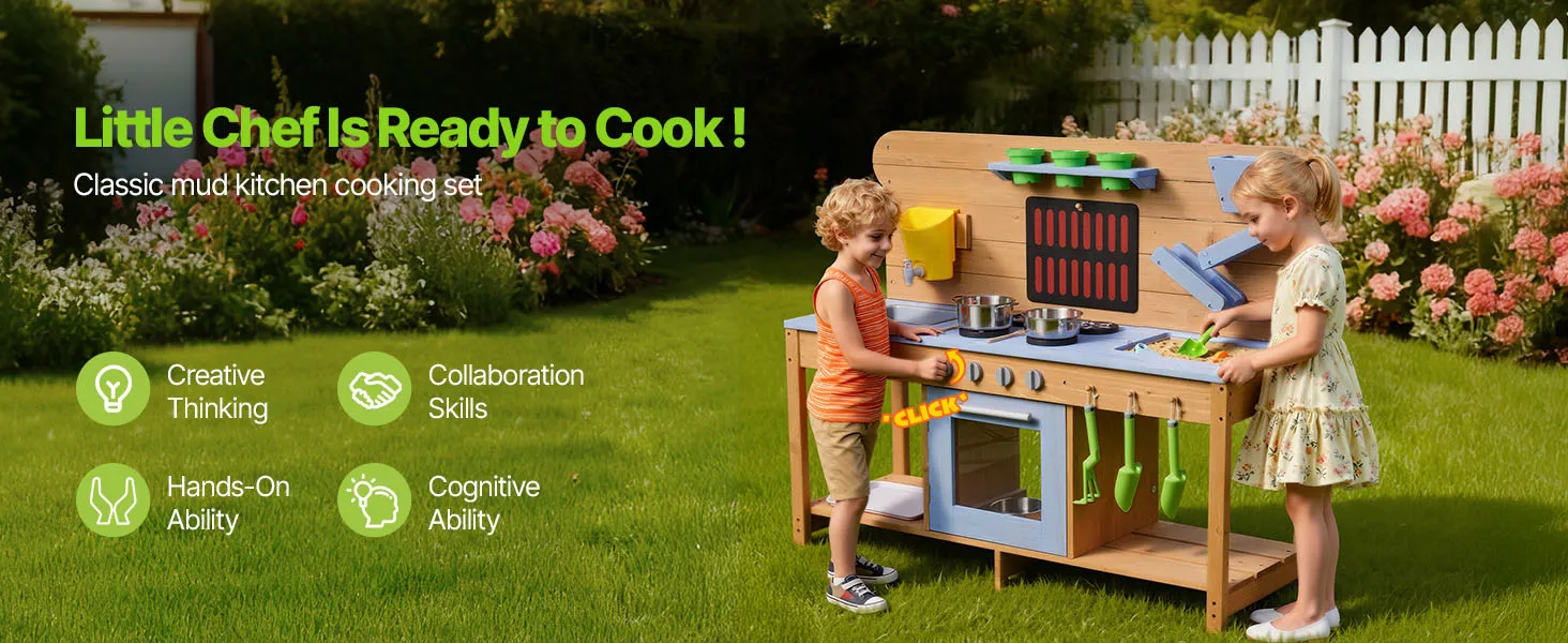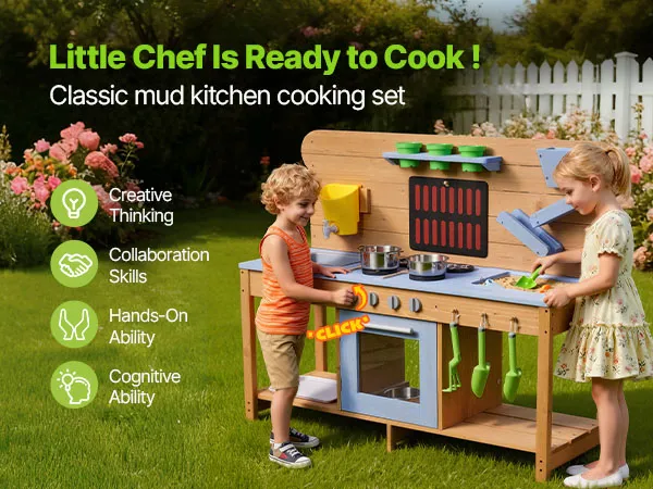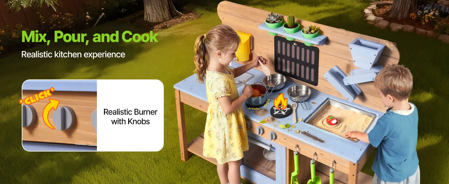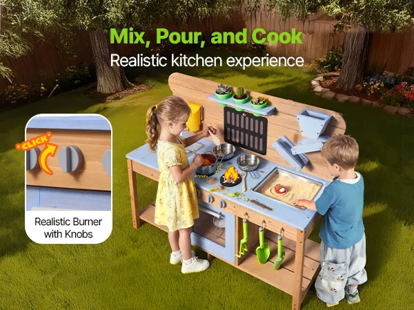 Realistyczna kuchnia do zabawy: Nasza błotna kuchnia dla maluchów jest wzorowana na prawdziwej kuchni i wyposażona w wyjątkowo szeroki blat roboczy, cztery palniki gazowe i dwa zlewy. Dzieci mogą wcielić się w rolę kucharzy i wspólnie się bawić – idealna na spotkania rodzinne lub zajęcia w przedszkolu.