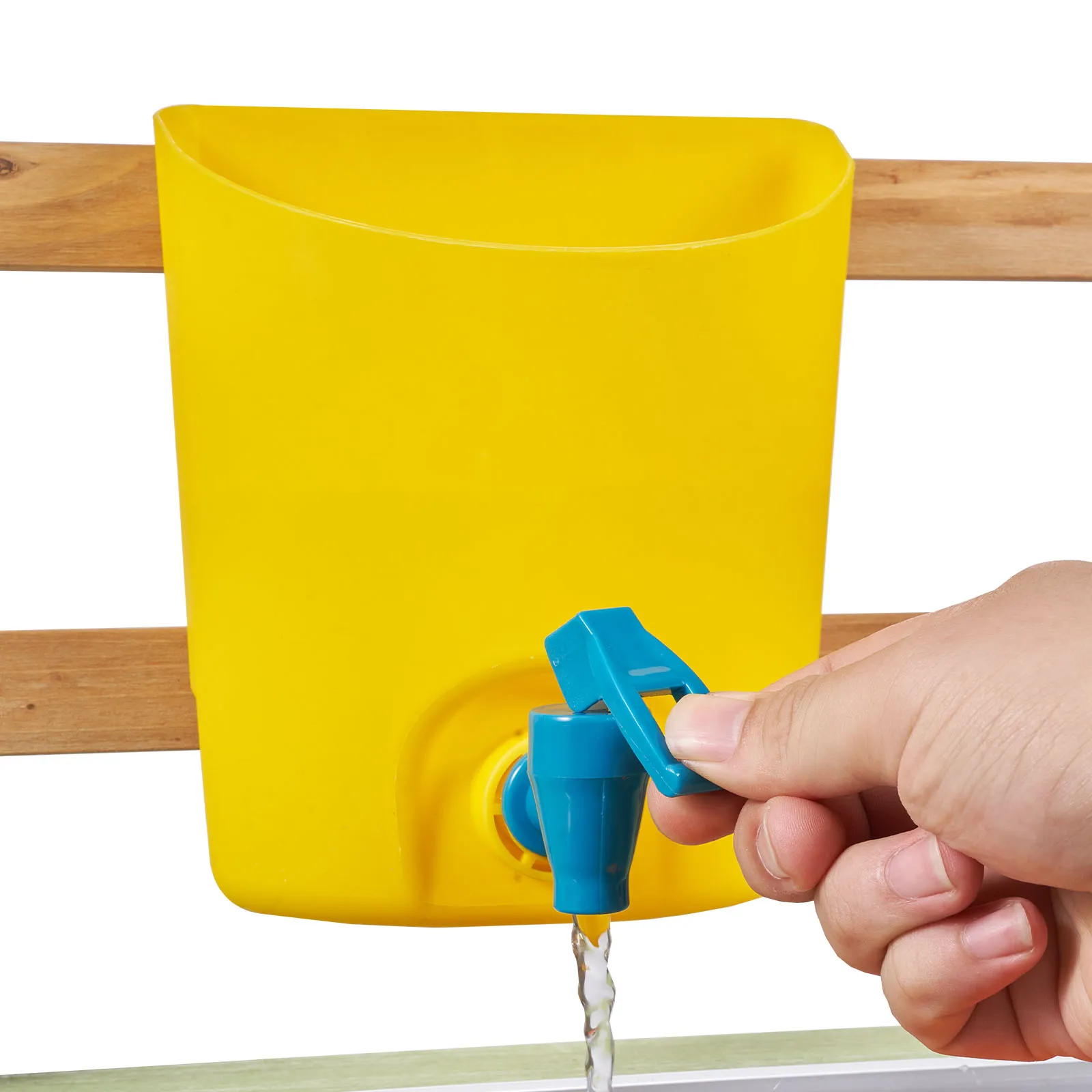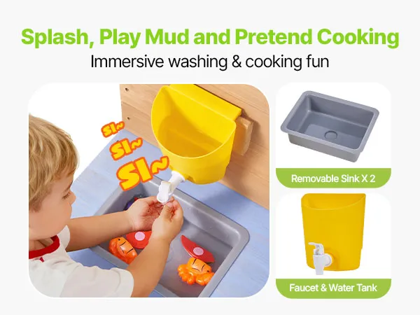 Zbiornik na wodę i wyjmowany zlew: Ta błotna kuchnia wyposażona jest w zbiornik na wodę z działającym kranem do napełniania oraz wyjmowany zlew, ułatwiający czyszczenie. Lejek do piasku i zabawkowa deska do krojenia rozwijają precyzję ruchów i logiczne myślenie.