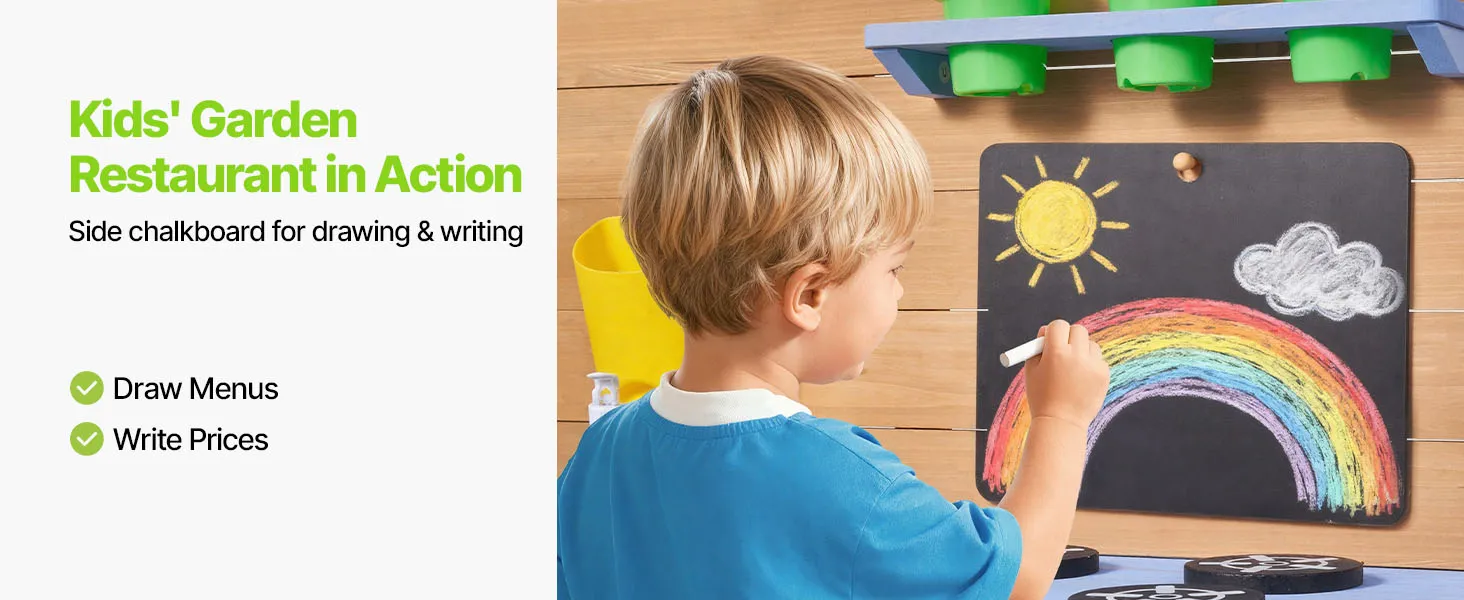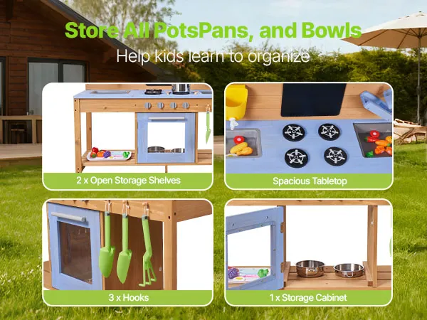 Wszechstronne place zabaw: Nasza zewnętrzna kuchnia błotna dla dzieci oferuje miejsce do gotowania, strefę do zabawy z wodą i piaskiem oraz akcesoria do sadzenia. W skład zestawu wchodzą 3 doniczki, 2 drewniane szpatułki, 3 kubki do sadzenia, 8 zabawek spożywczych i 1 fartuch – wszystko to dla kreatywnej zabawy w kuchni na świeżym powietrzu.
