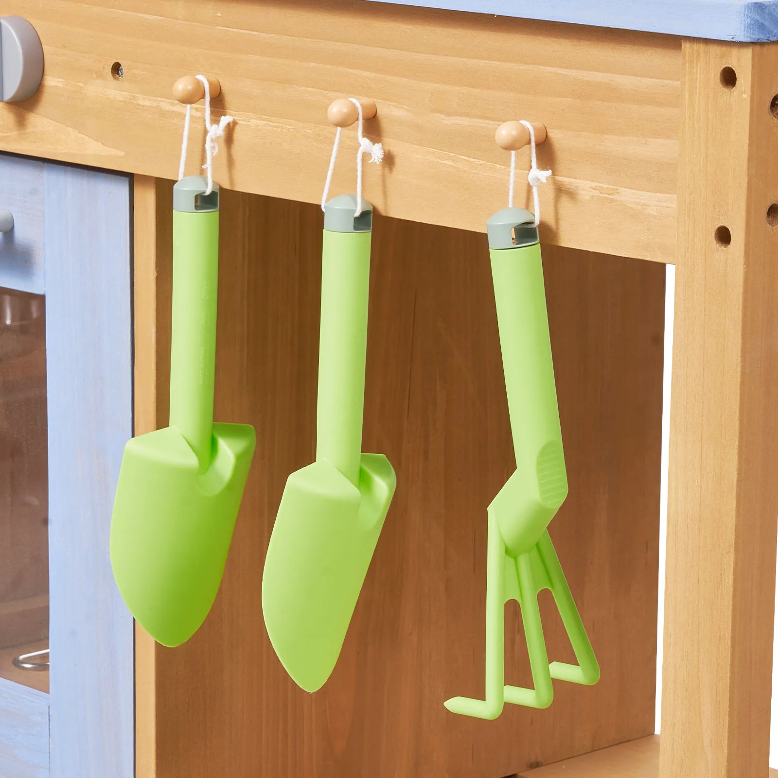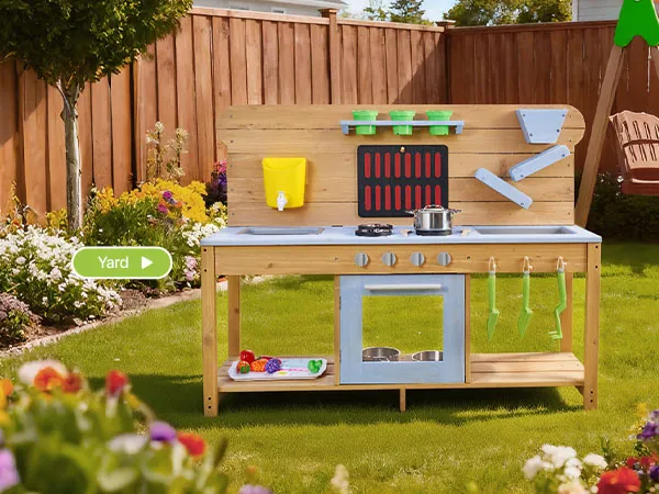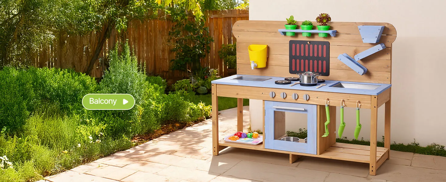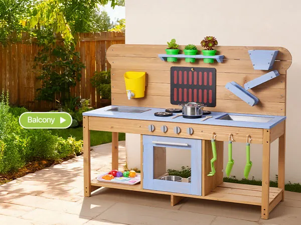 Kompaktowa i zajmująca niewiele miejsca: dzięki wysokości stołu 520 mm i wymiarom całkowitym 1220 x 425 x 930 mm, ta ogrodowa kuchnia błotna jest łatwa w obsłudze dla dzieci, bez konieczności schylania się. Nadaje się do podwórek, ogrodów lub tarasów, tworząc wydzieloną strefę do zabawy na świeżym powietrzu.