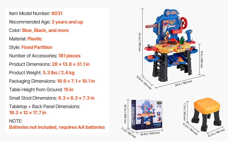 VEVOR Dziecięcy stół warsztatowy, 181-elementowy stół narzędziowy z realistycznymi narzędziami i wiertarką elektryczną, narzędzia budowlane dla dzieci, edukacyjna zabawka dla małych dzieci w wieku od 3 lat