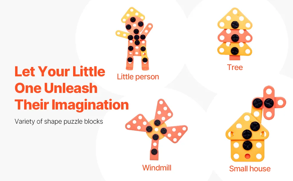 Twórz różne konstrukcje: pozwól swojemu dziecku rozwinąć wyobraźnię! Dzięki klockom puzzlowym o różnych kształtach można tworzyć nieskończoną liczbę projektów. Ta zabawka warsztatowa rozwija zdolności motoryczne i zdolność rozwiązywania problemów, jednocześnie zachęcając do samodzielnej zabawy. Idealne dla małych rączek i wielkich pomysłów, niezbędne do pobudzenia dziecięcej kreatywności!