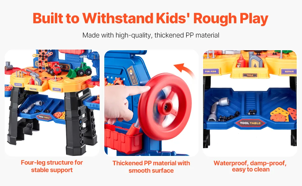 Bezpieczeństwo przede wszystkim! Ten stół warsztatowy dla maluchów wykonany jest z wysokiej jakości, grubego materiału PP, ma gładką powierzchnię i nie ma ostrych krawędzi, dzięki czemu idealnie nadaje się do swobodnej zabawy dzieci. Solidna konstrukcja z czterema nogami gwarantuje długą żywotność.