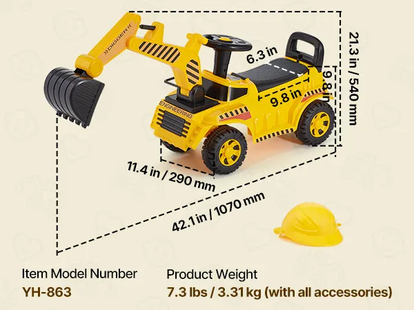 Koparka jeździk VEVOR, dziecięca koparka dla maluchów w wieku od 19 do 36 miesięcy, zabawka w kształcie koparki z kaskiem i muzyką, jeździk, udźwig 25 kg, jeździk, pomoc w chodzeniu dla dzieci, żółty