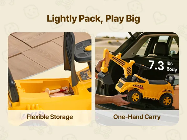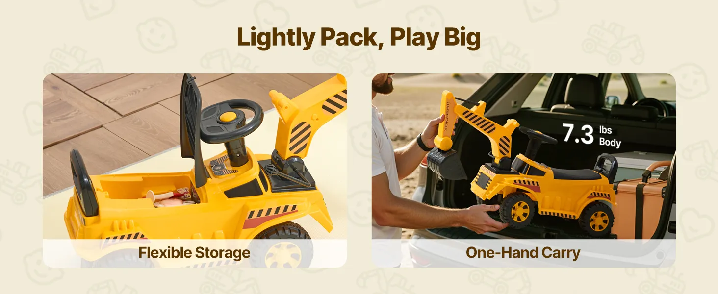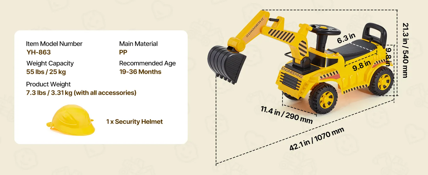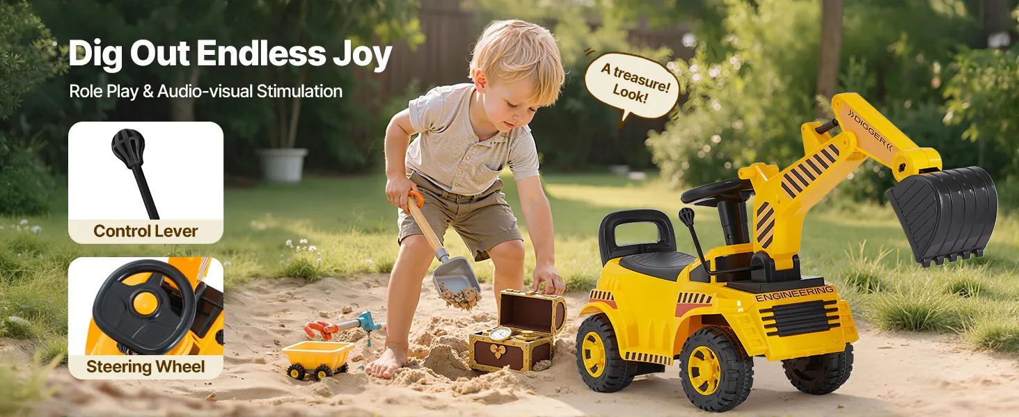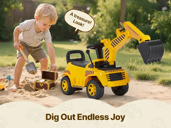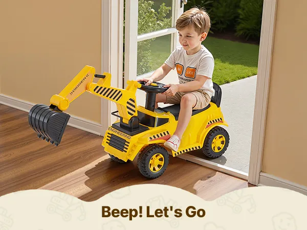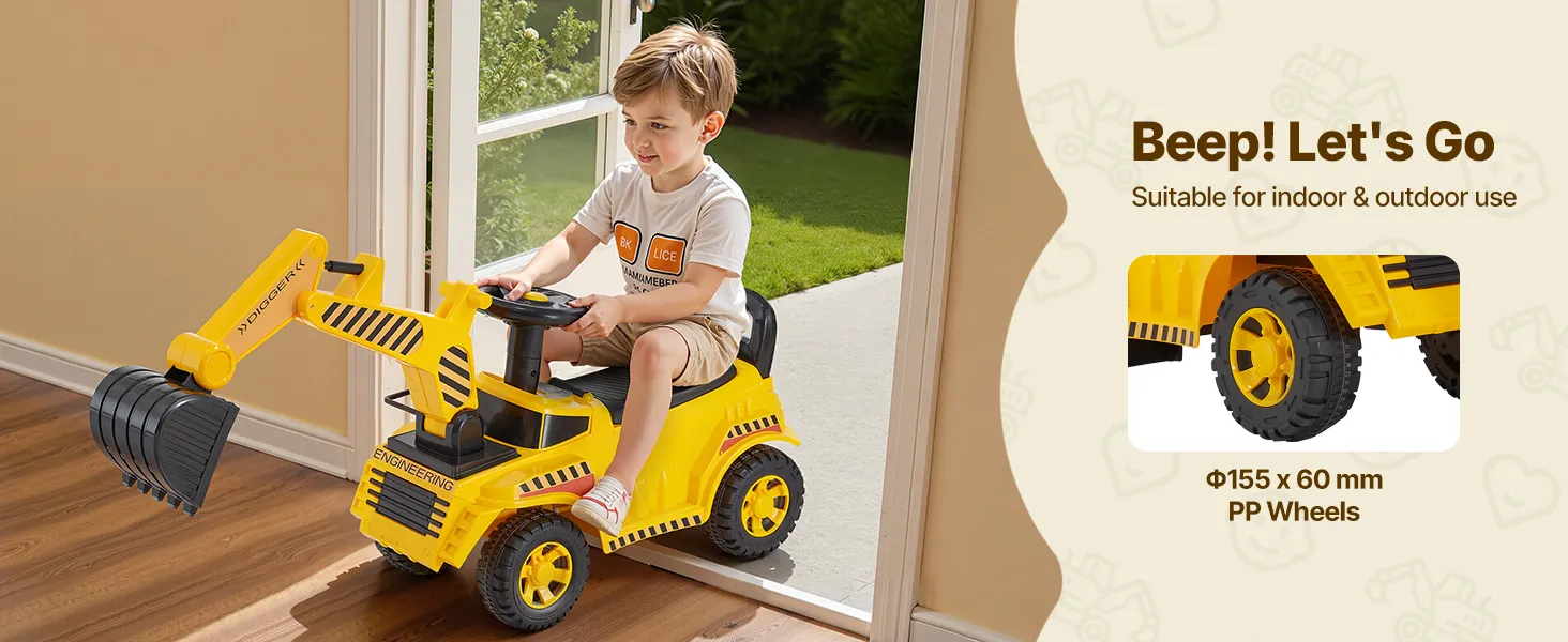 Niezależnie od tego, czy w domu, czy w parku, ta koparka zamieni każdy pokój w strefę zabawy! Antypoślizgowe koła zapewniają Twojemu dziecku bezpieczne siedzenie podczas jazdy.