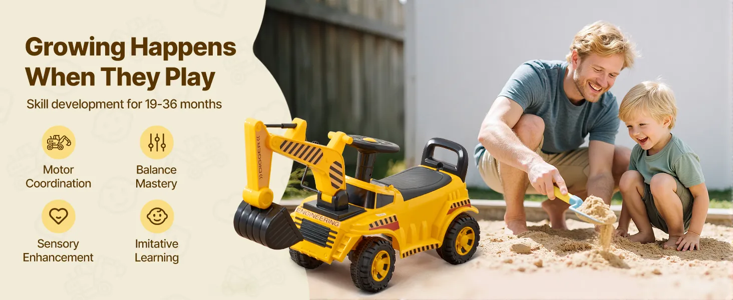 Trening mięśni i równowagi: przeznaczony dla dzieci w wieku od 19 do 36 miesięcy, ten siedzeniowy pojazd-koparka pomaga rozwijać siłę nóg i koordynację poprzez naturalne pedałowanie oraz poprawia równowagę podczas zabawy w domu lub w parku