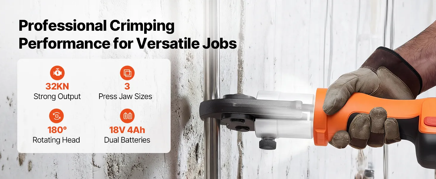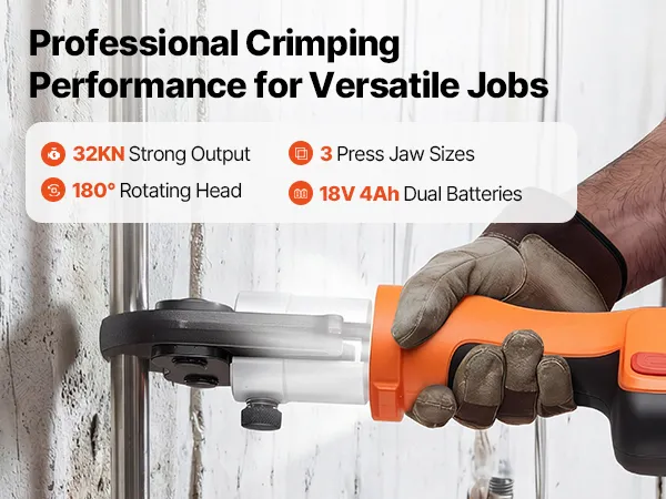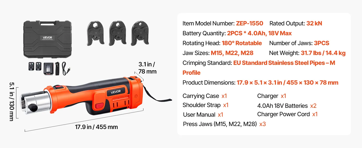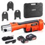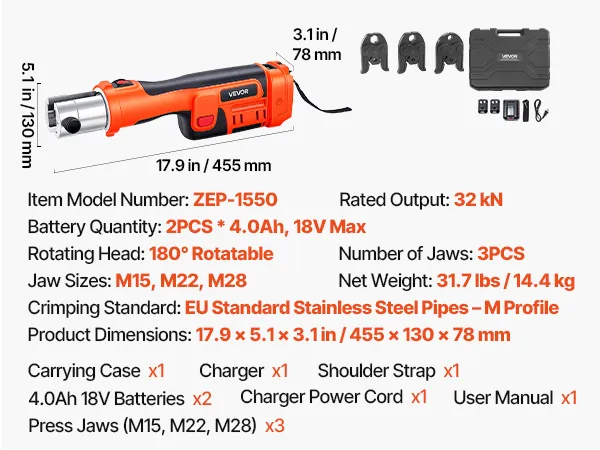 Zestaw zaciskarek akumulatorowych VEVOR 18 V, zaciskarka 32 kN z 3 szczękami zaciskającymi M15, M22, M28 i głowicą obrotową 180°, elektryczna zaciskarka z akumulatorami 4,0 Ah do rur ze stali nierdzewnej do 54 mm, 40 HRC dla wysokiej wydajności