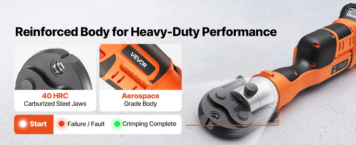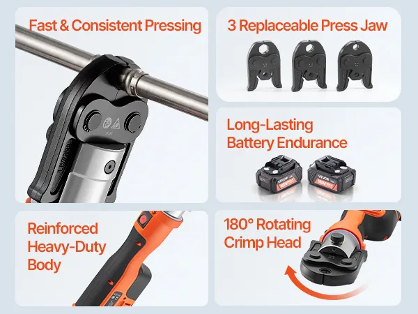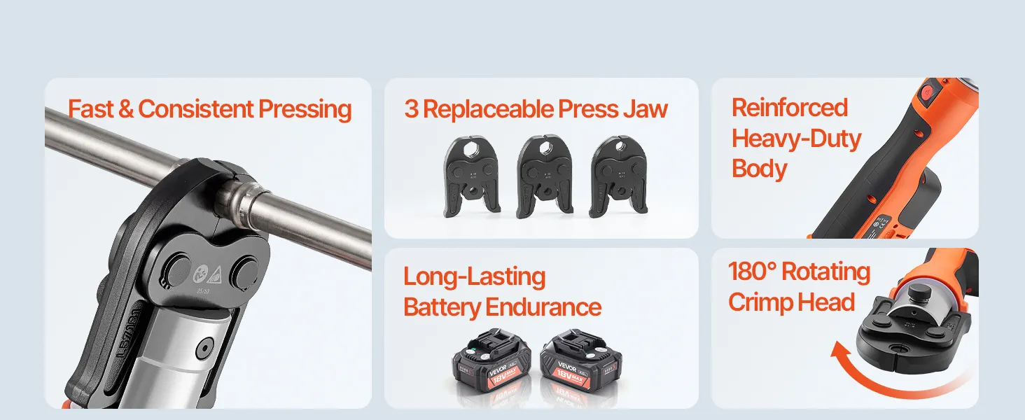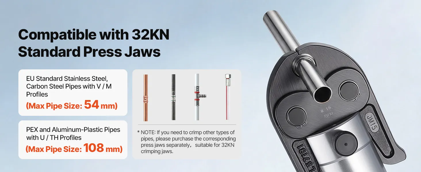 Szeroki zakres zastosowań: Nadaje się do instalacji i napraw rur w projektach mieszkaniowych i przemysłowych. Kompatybilny ze standardowymi szczękami zaciskowymi o sile nacisku 32 kN. Do zaciskania innych typów rur należy zakupić odpowiednie szczęki zaciskowe osobno.