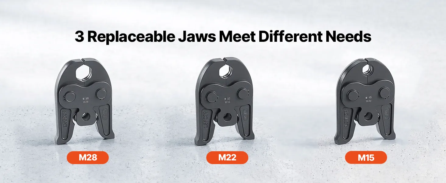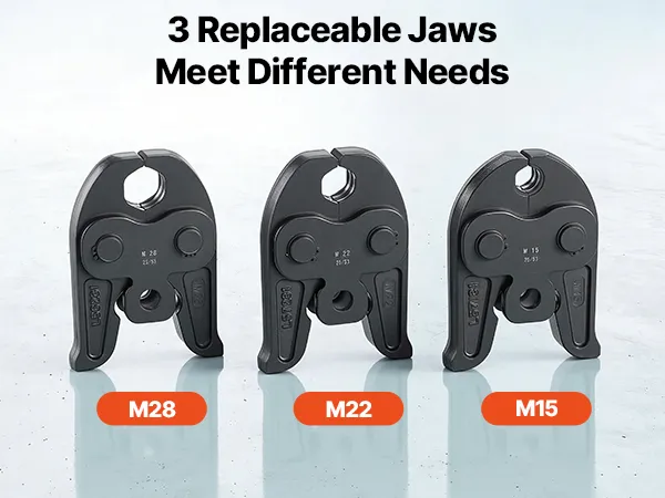 Wszechstronne rozmiary szczęk: Ta zaciskarka do rur zawiera trzy szczęki zaciskowe (M15, M22, M28) przeznaczone do europejskich systemów rur ze stali nierdzewnej o profilu M. Każda szczęka umożliwia precyzyjne i bezpieczne zaciskanie, gwarantuje szczelność połączeń i pomaga zmniejszyć ryzyko wycieku.
