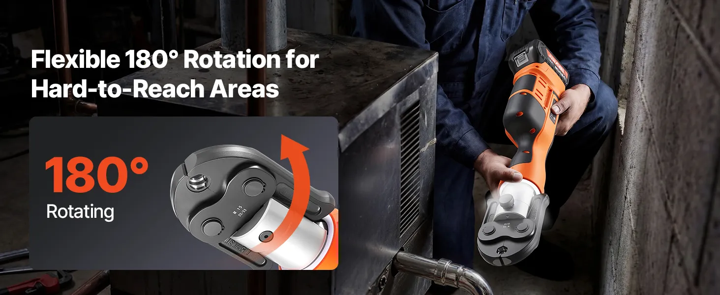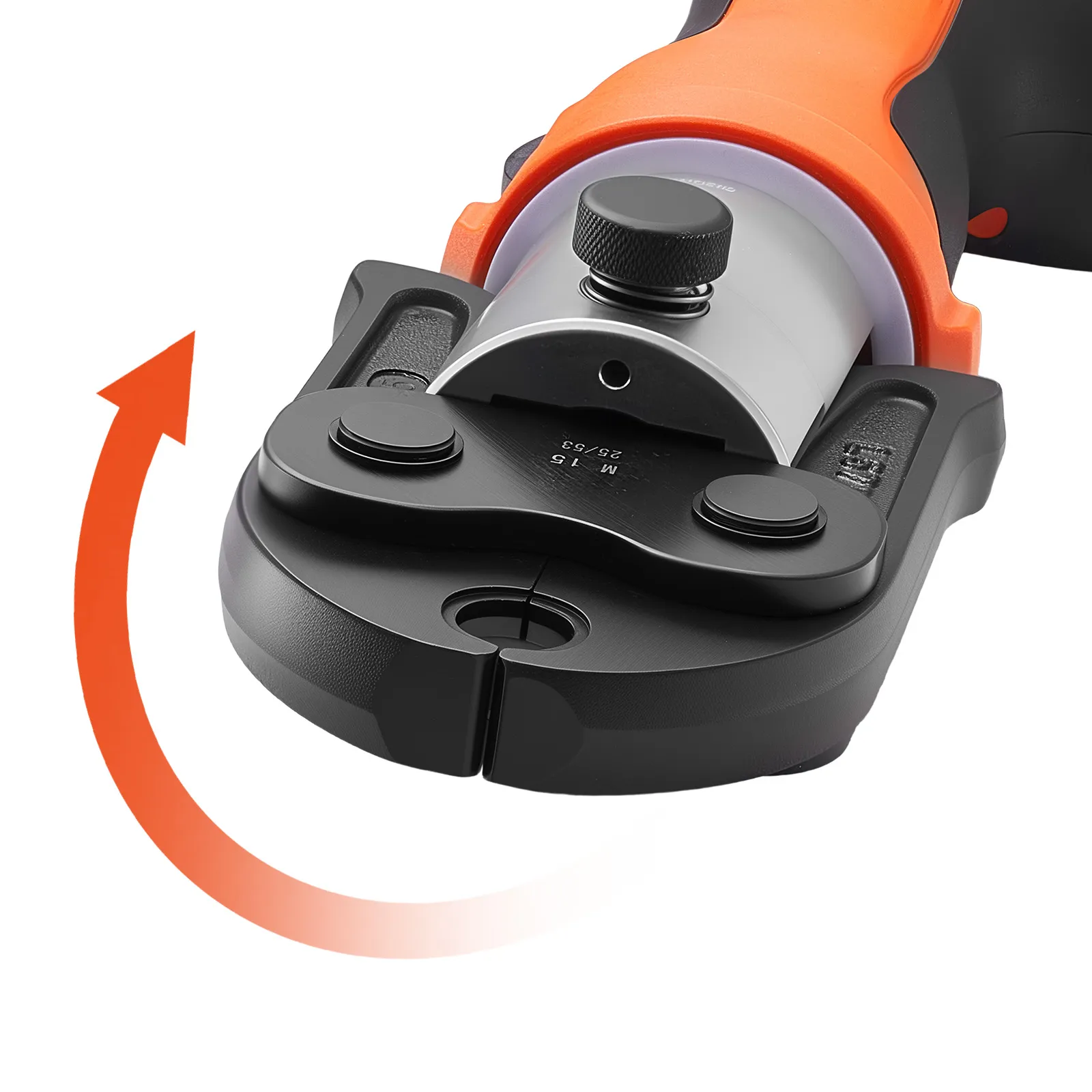Głowicę zaciskającą można łatwo obrócić o 180°, aby dotrzeć nawet do trudno dostępnych miejsc. Pozwala to na elastyczne pozycjonowanie i precyzyjne zaciskanie, nawet w trudno dostępnych miejscach.
