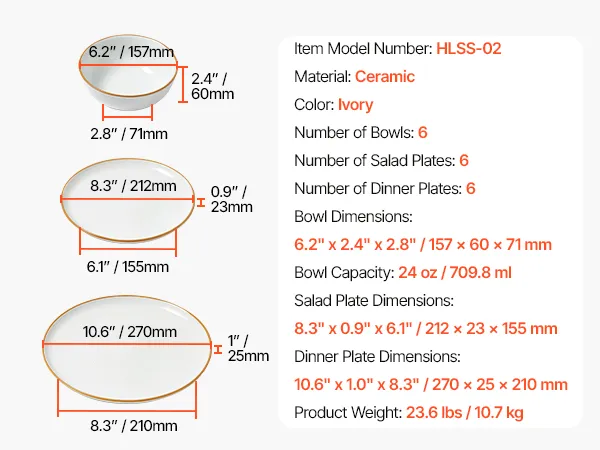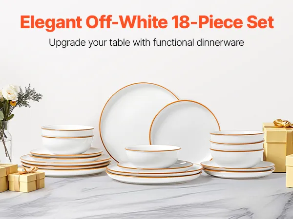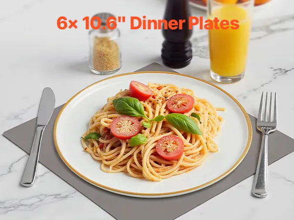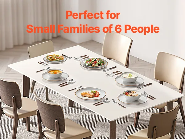 Niezbędny dla sześcioosobowej rodziny: Ten 18-częściowy zestaw obiadowy zawiera sześć misek o średnicy 6,4 cala (162 mm), sześć talerzy sałatkowych o średnicy 8,6 cala (21,8 cm) i sześć talerzy obiadowych o średnicy 10,6 cala (27 cm). Nadaje się do różnych posiłków i jest idealny na spotkania towarzyskie. To także świetny prezent na parapetówkę.