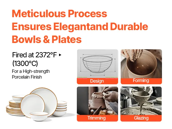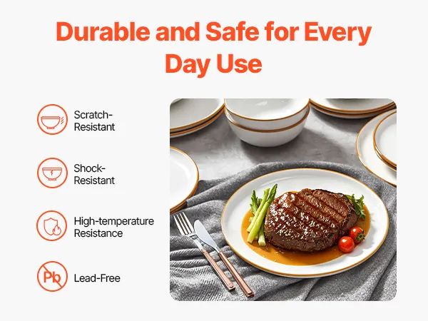 Trwała ceramika: Pogrubiony zestaw talerzy i misek jest wypalany w temperaturze 2372 ℉ (1300 °C), co zapewnia odporność na pęknięcia, zarysowania, doskonałą odporność na ciepło i możliwość wytrzymywania częstego, długoterminowego codziennego użytkowania