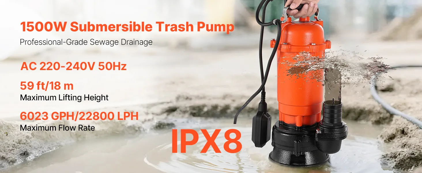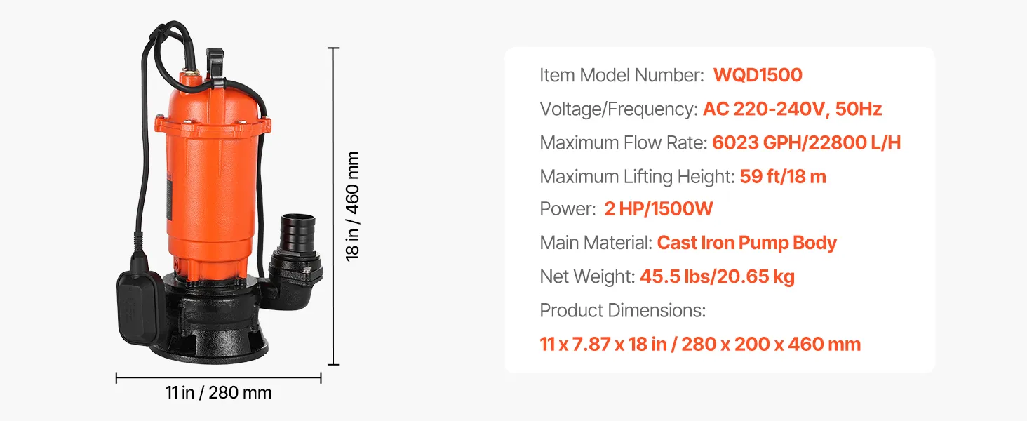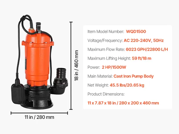 Szybkie i wydajne odprowadzanie ścieków: Wyposażona w solidny silnik o mocy 1500 W (2 KM) pompa zanurzeniowa zapewnia wydajność do 22 800 l/h (6023 GPH) i osiąga maksymalną wysokość podnoszenia 18 m (59 stóp), zapewniając szybkie i wydajne odprowadzanie ścieków