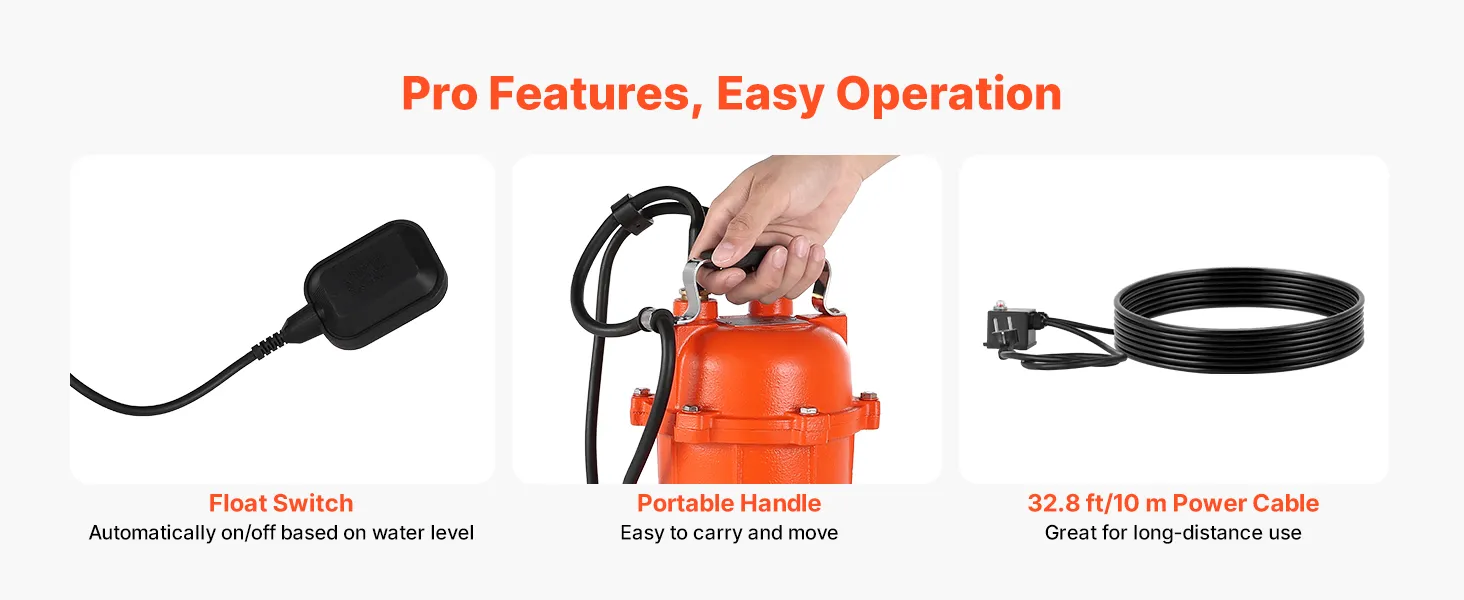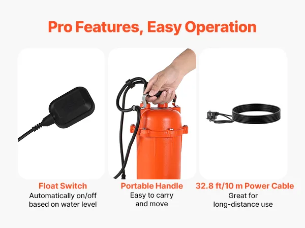 Wyłącznik pływakowy automatycznie włącza i wyłącza tę zanurzalną pompę ściekową w zależności od poziomu wody, eliminując potrzebę ciągłego monitorowania. Przenośny uchwyt ułatwia transport, a długi przewód zasilający pozwala na elastyczne ustawienie pompy, co zapewnia bezproblemowe odprowadzanie ścieków.