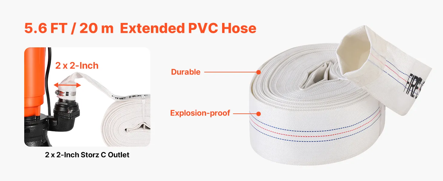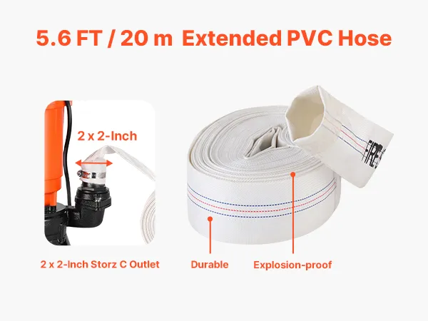 Kompatybilność z szerokim wężem: Ta elektryczna pompa do brudnej wody posiada 2-calowy wylot i pasuje do większości standardowych przyłączy węży. Wąż o długości 20 m jest odporny na pękanie i sprawdzi się nawet w najtrudniejszych warunkach na placu budowy.