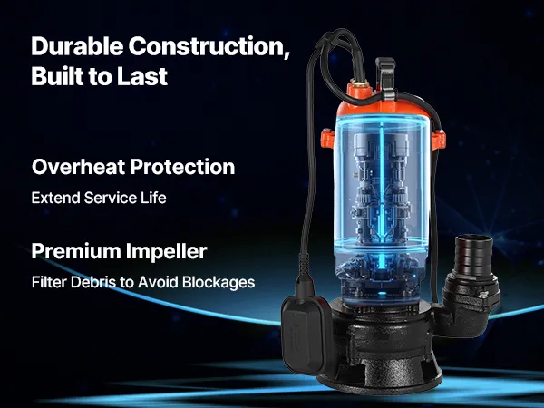 Wyposażona jest w wysokiej jakości wirnik, który filtruje zanieczyszczenia, zapobiegając zatykaniu i zapewniając płynną pracę. Zintegrowany system zabezpieczenia przed przegrzaniem chroni silnik i wydłuża żywotność pompy zatapialnej.