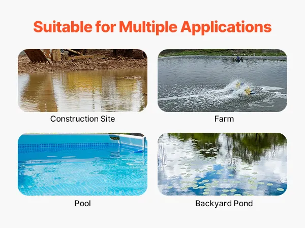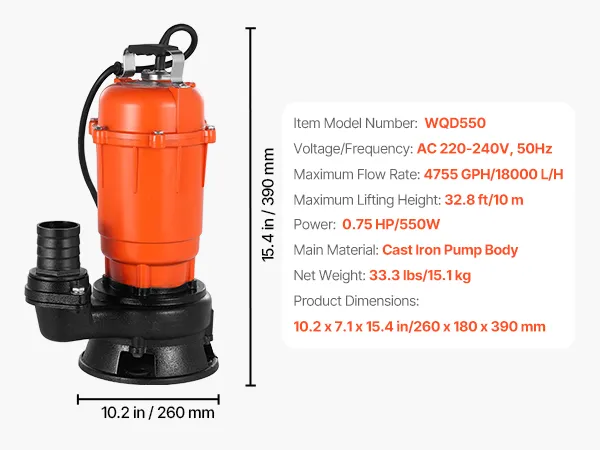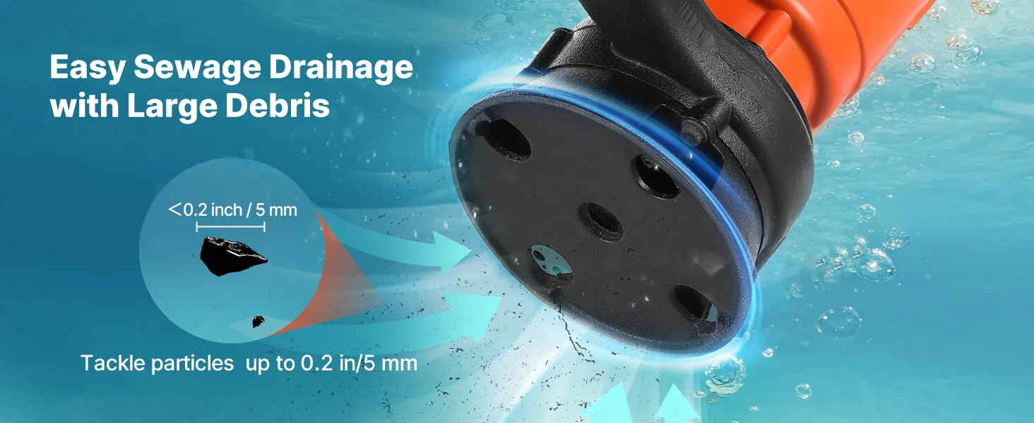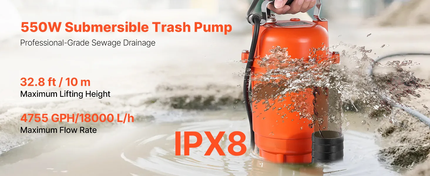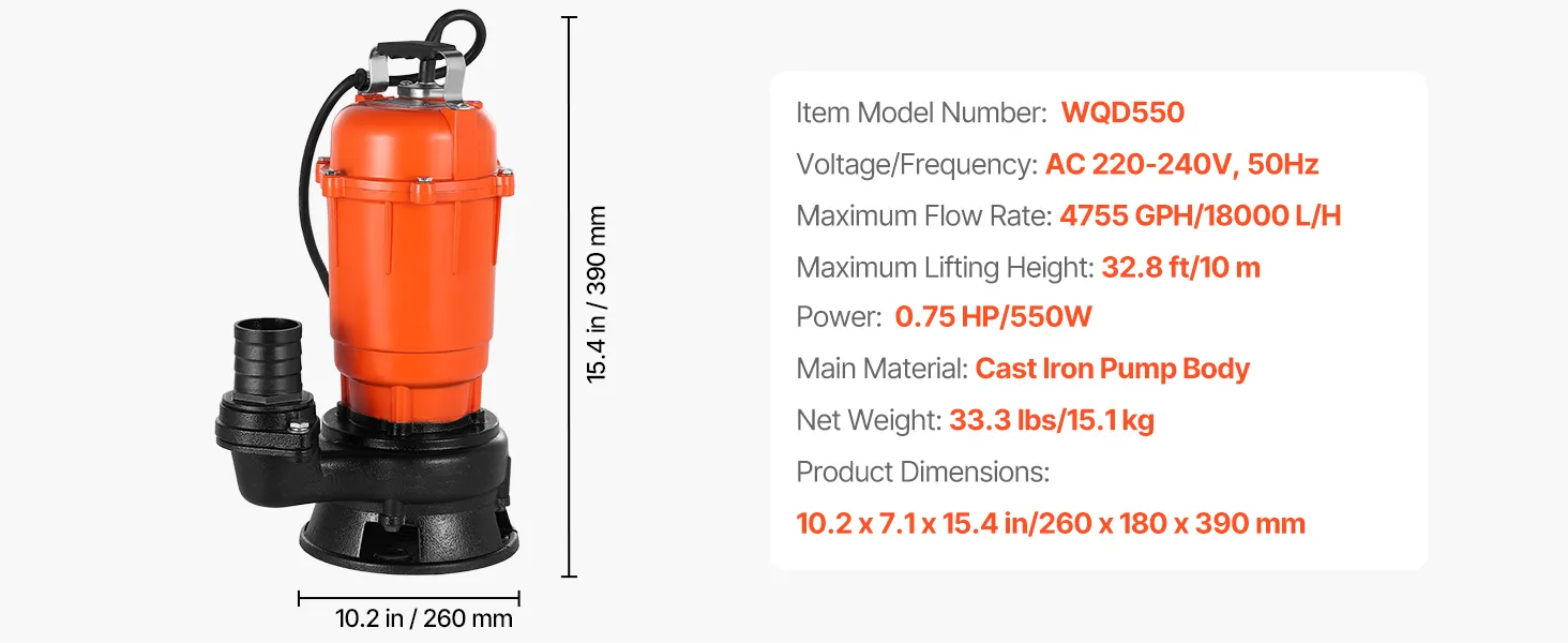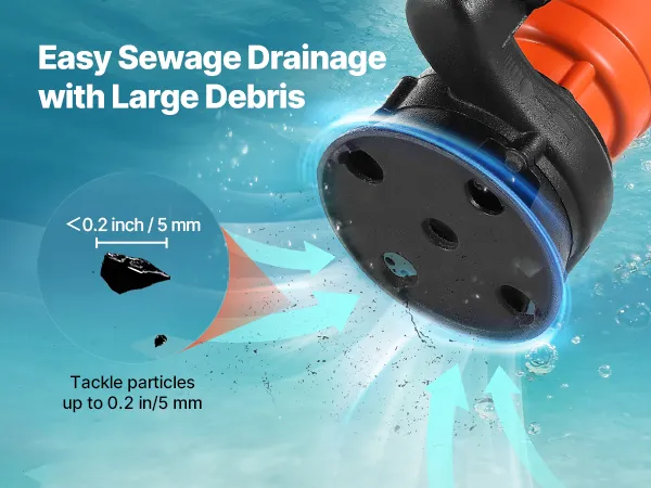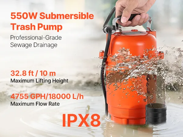 Szybkie i wydajne odprowadzanie ścieków: Wyposażona w solidny silnik o mocy 550 W (3/4 KM) pompa zanurzeniowa zapewnia wydajność do 18 000 l/h (4755 GPH) i osiąga maksymalną wysokość podnoszenia 10 m (32,8 stopy), zapewniając szybkie i wydajne odprowadzanie ścieków