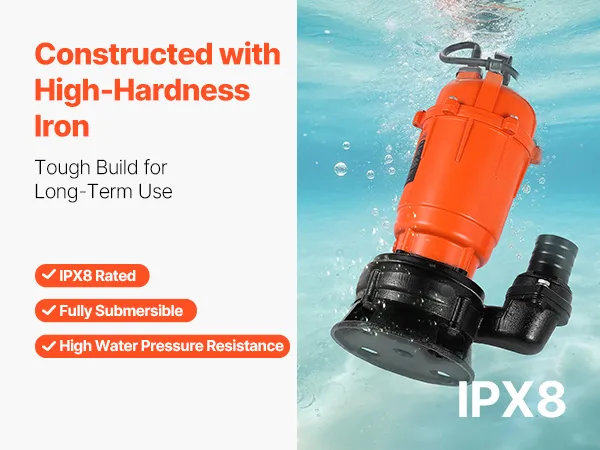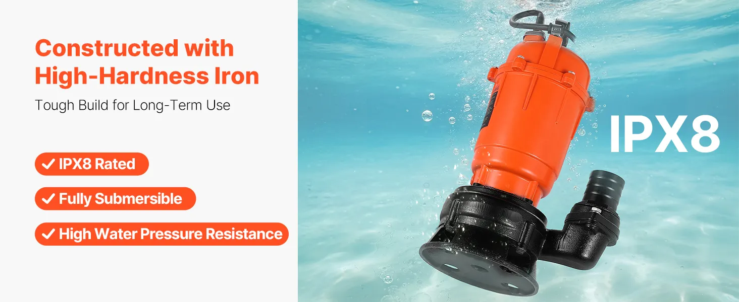 Doskonała szczelność: Wykonana z wytrzymałego żelaza, pompa zanurzeniowa oferuje wodoodporność IPX8, gwarantując doskonałą szczelność. Nadaje się do długotrwałego stosowania w warunkach wysokiego ciśnienia.