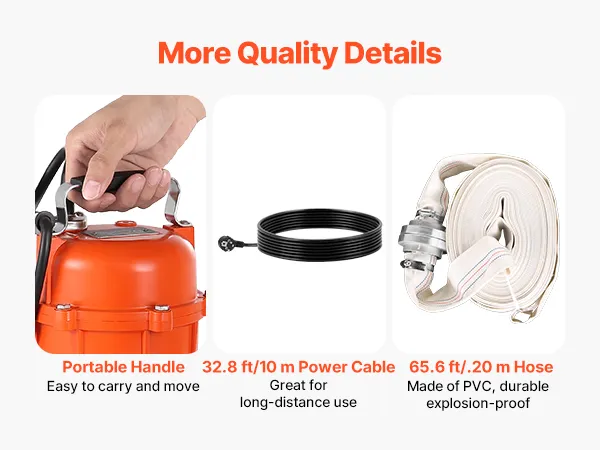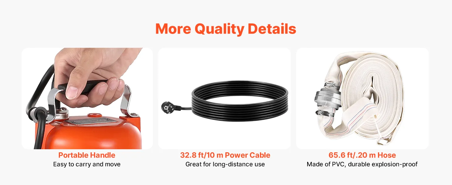 Kompatybilność z szerokim wężem: Ta elektryczna pompa do brudnej wody posiada wylot o średnicy 2 cali (5,08 cm) i pasuje do większości standardowych przyłączy węży. Wąż o długości 20 m jest odporny na pękanie i sprawdzi się nawet w najtrudniejszych warunkach na placu budowy.