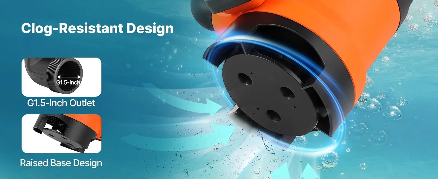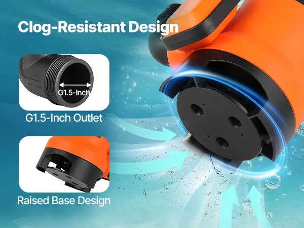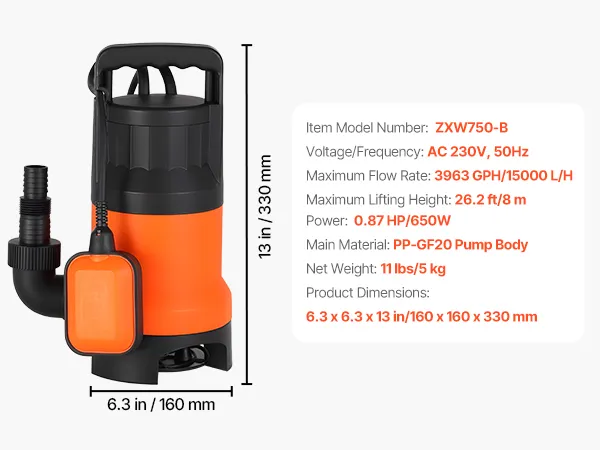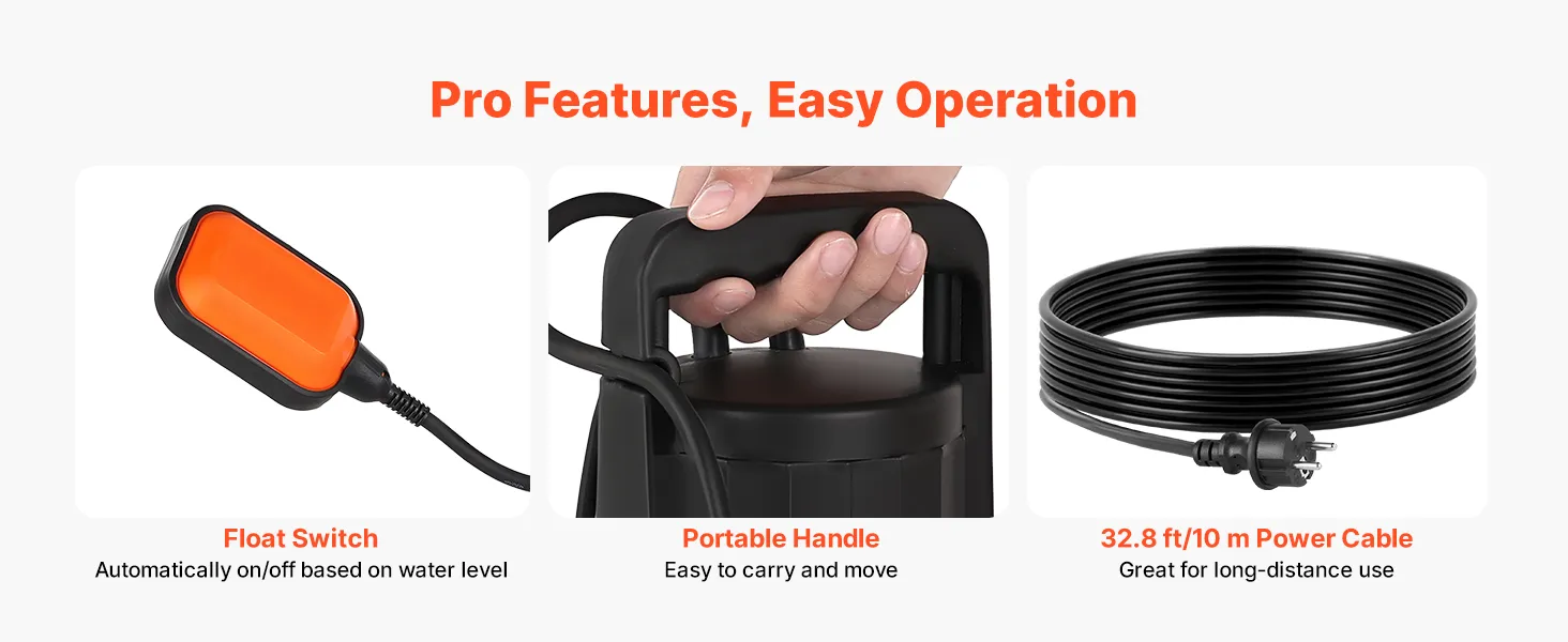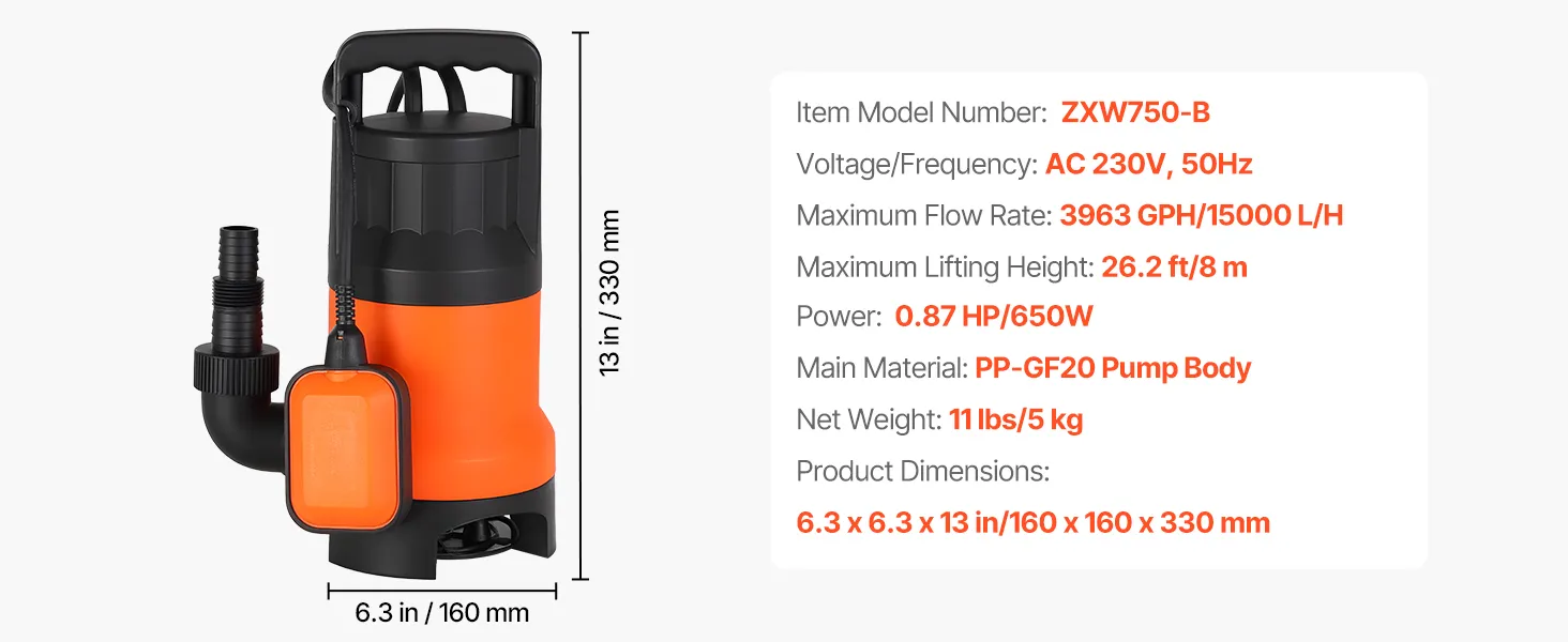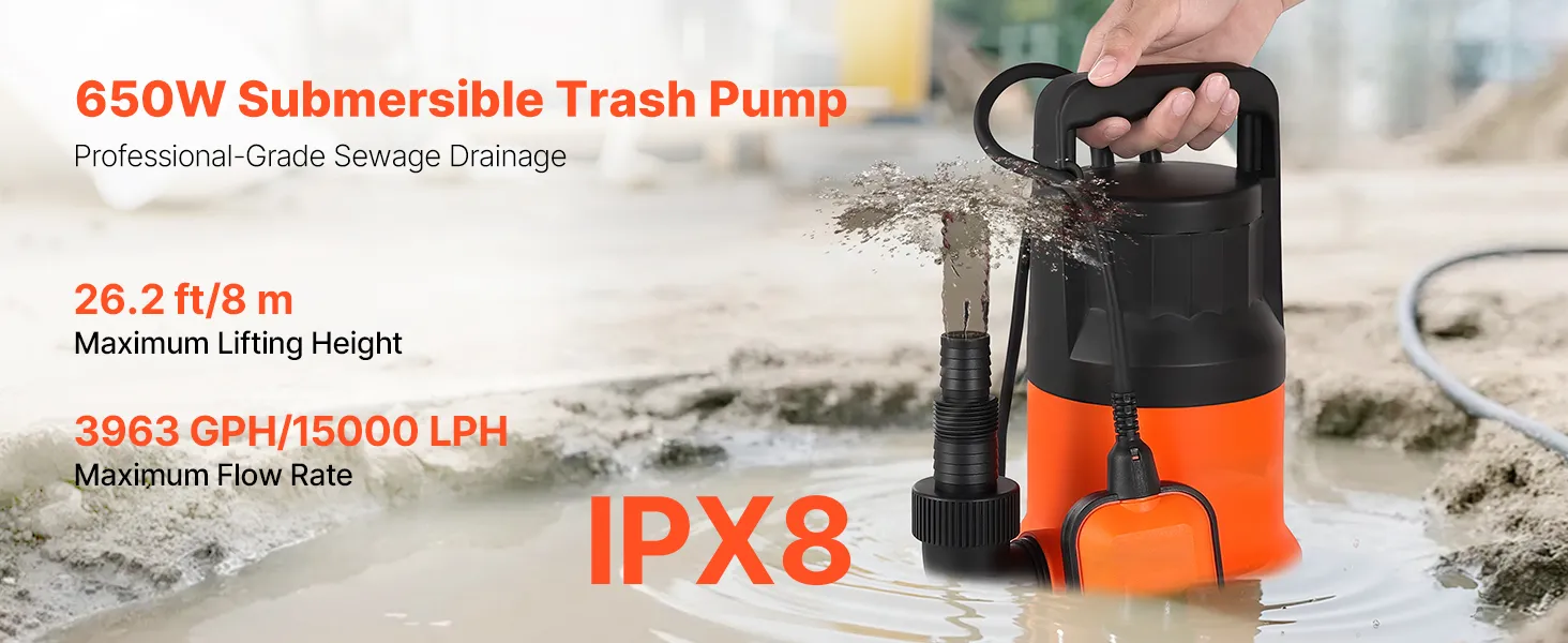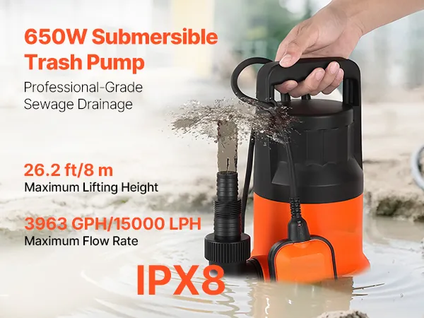 Szybkie i wydajne odprowadzanie ścieków: Wyposażona w solidny silnik o mocy 650 W (0,87 KM) pompa zanurzeniowa zapewnia wydajność do 15 000 l/h (3963 GPH) i osiąga maksymalną wysokość podnoszenia 8 m (26,2 stopy), zapewniając szybkie i wydajne odprowadzanie ścieków