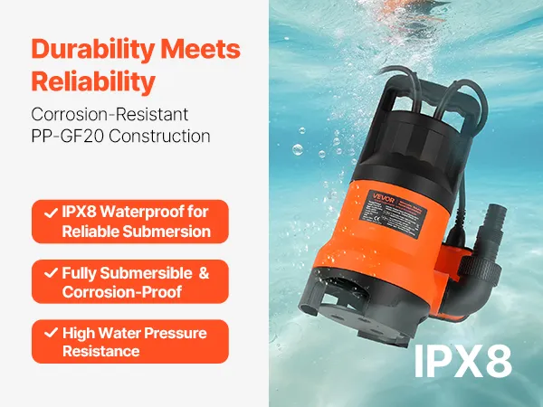 Doskonała szczelność: Wykonana z wysokiej jakości PP-GF20, zatapialna pompa ściekowa oferuje wodoodporność IPX8, gwarantując doskonałą szczelność. Nadaje się do długotrwałego stosowania w warunkach wysokiego ciśnienia.