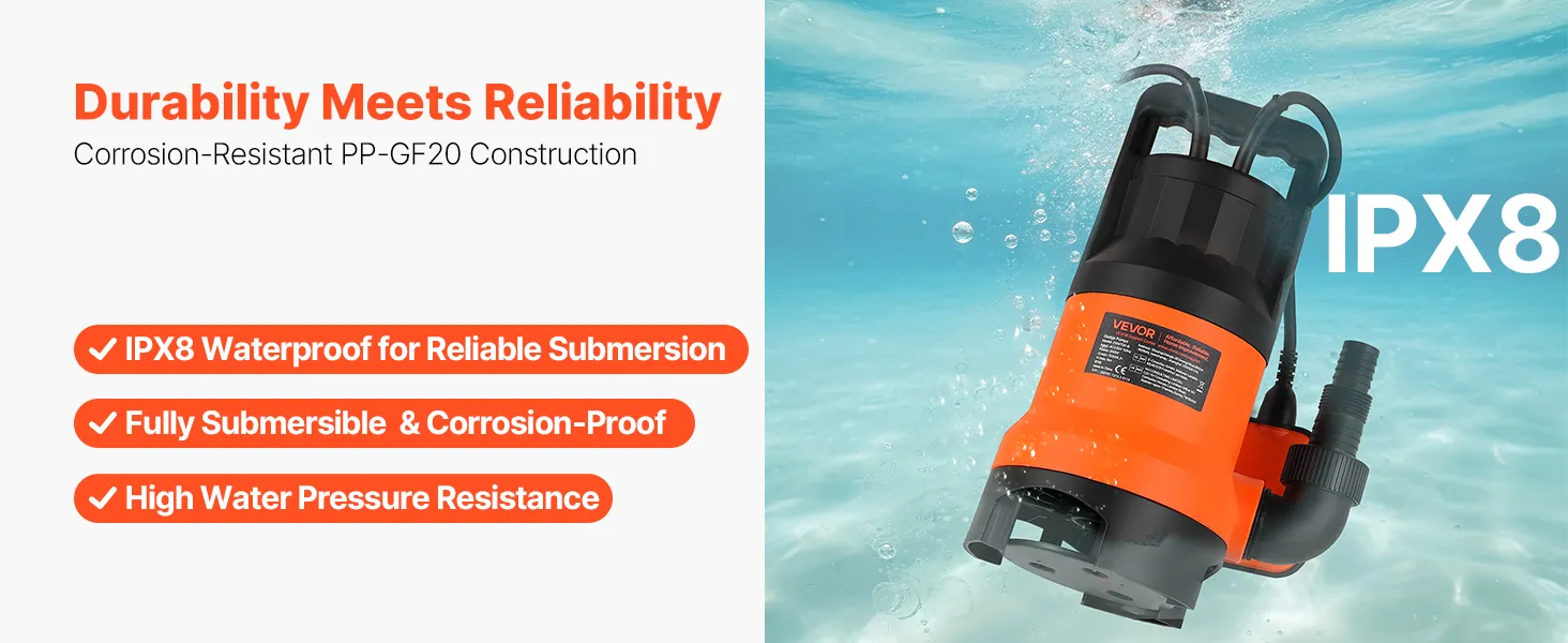 Pompa zanurzeniowa VEVOR 650 W, 15000 l/h, PP-GF20, pompa do brudnej wody, ścieków, wody brudnej i czystej, z automatycznym wyłącznikiem pływakowym, wysokość podnoszenia 8 m, do basenów, stawów i zalanych obszarów