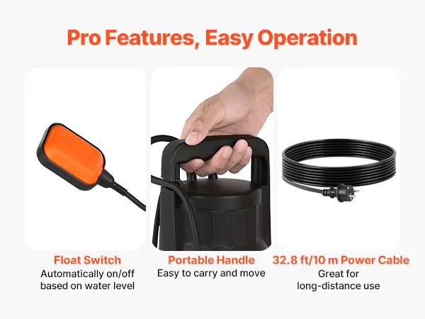 Wyłącznik pływakowy automatycznie włącza i wyłącza tę zanurzalną pompę szlamową w zależności od poziomu wody, eliminując potrzebę ciągłego monitorowania. Przenośny uchwyt ułatwia transport, a długi przewód zasilający pozwala na elastyczne ustawienie pompy, co pozwala na bezproblemowe odprowadzanie brudnej wody.
