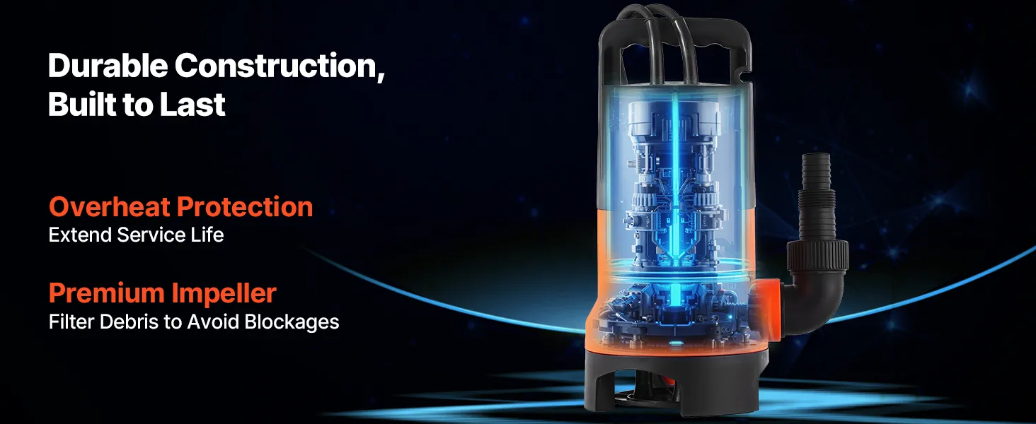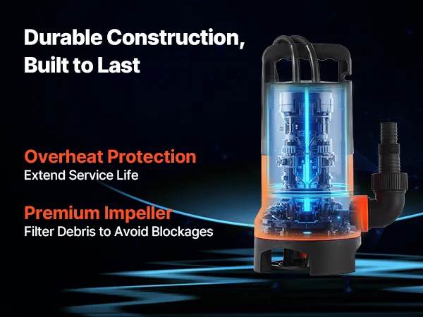 Wyposażona jest w wysokiej jakości wirnik, który filtruje zanieczyszczenia, zapobiegając zatykaniu i zapewniając płynną pracę. Zintegrowany system zabezpieczenia przed przegrzaniem chroni silnik i wydłuża żywotność pompy zanurzeniowej do brudnej wody.