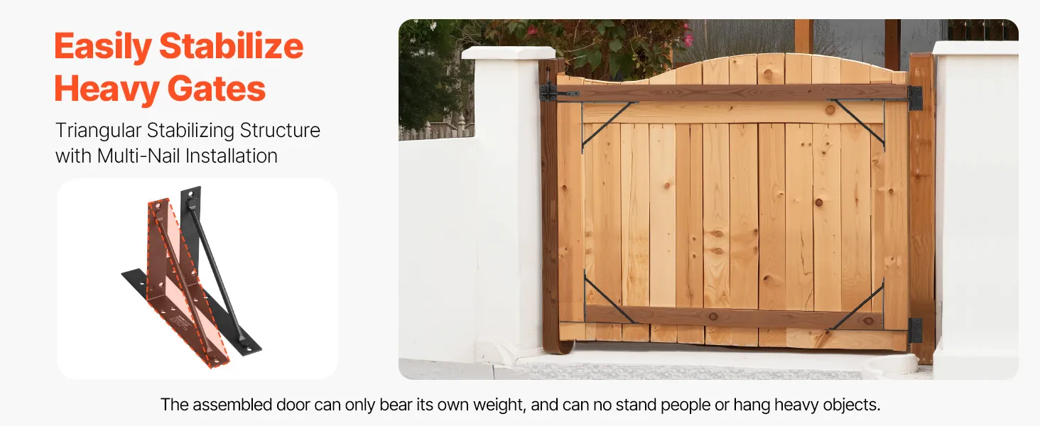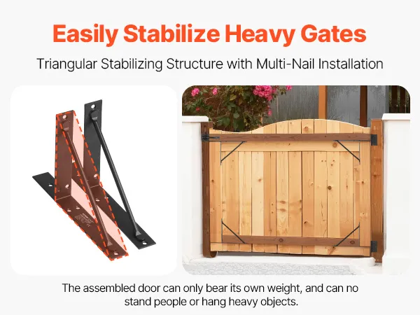 Stabilna konstrukcja: Dzięki trójkątnej konstrukcji wsporczej na wszystkich czterech rogach i spawanym zawiasom, ten wspornik ramy bramy charakteryzuje się doskonałą nośnością. Jest odporny na zginanie i odkształcenia, a także stanowi solidne i stabilne rozwiązanie do długotrwałego użytkowania.