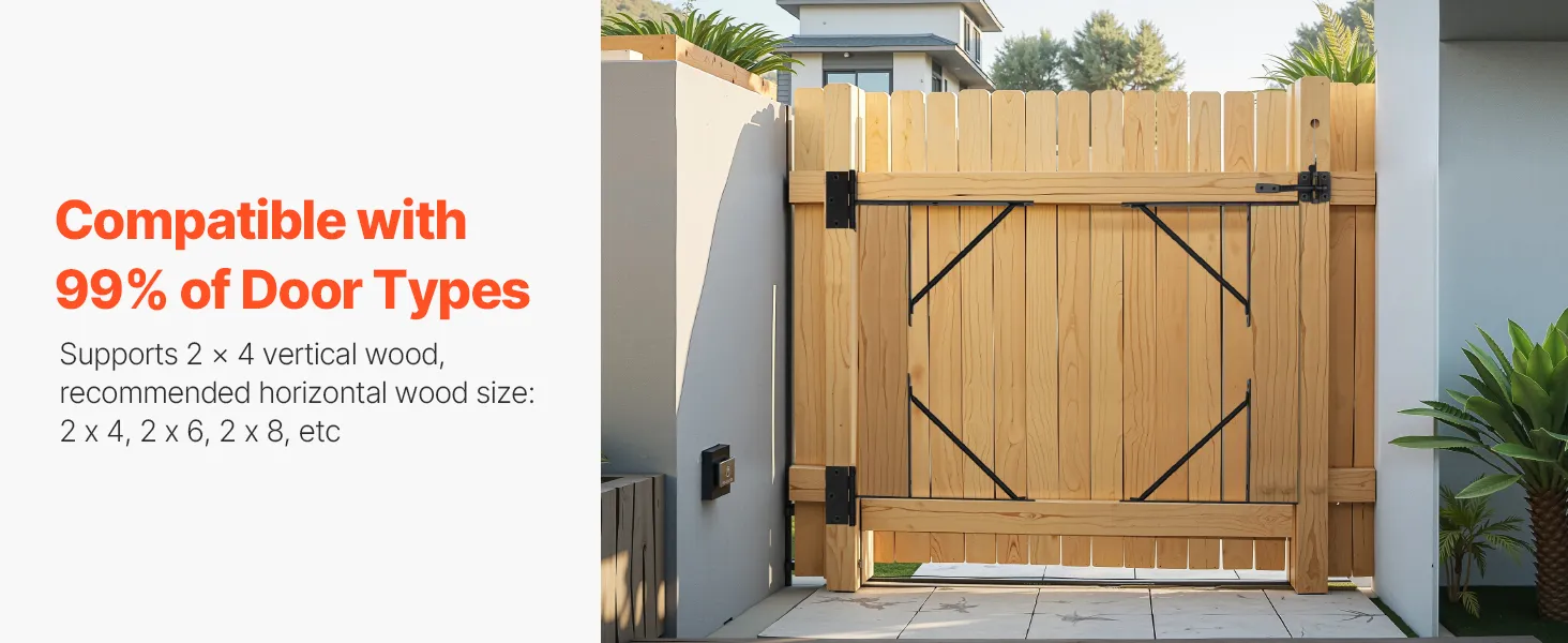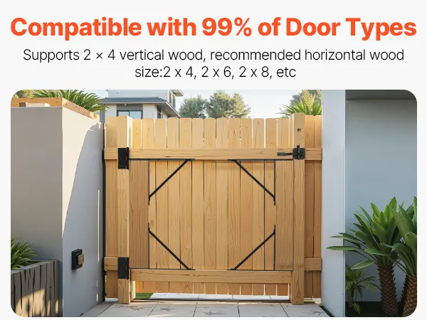 Kompatybilne z 99% wszystkich typów drzwi, w tym drzwiami do szop, bramami podjazdowymi, bramami dla bydła, drewnianymi oknami, drzwiami tarasowymi, bramami basenowymi, drzwiami do stodoły i wieloma innymi. Zestaw osprzętu do ramy bramy pasuje do drewna o wymiarach 2" x 4" i większych, zapewniając wszechstronne rozwiązanie do różnych instalacji drzwi.