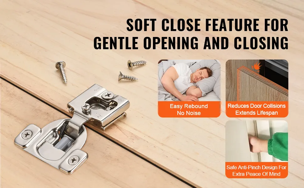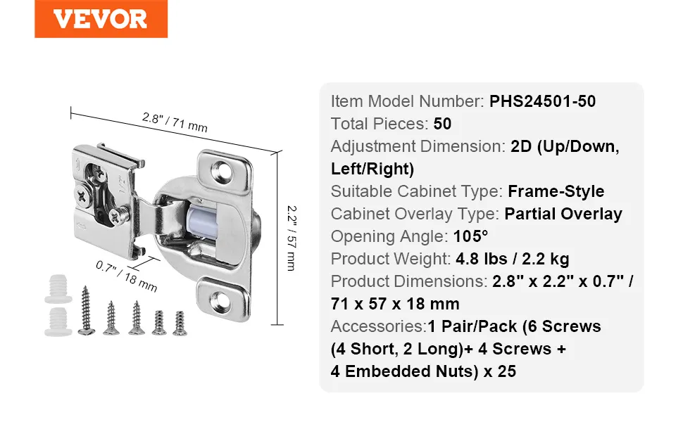 Zawiasy do drzwi szafkowych VEVOR, zestaw 50 elementów, zawiasy meblowe częściowo nakładane, kąt otwarcia 105 stopni, ciche zamykanie, zawiasy do szafek ramowych, ze śrubami montażowymi, 71 x 57 x 18 mm